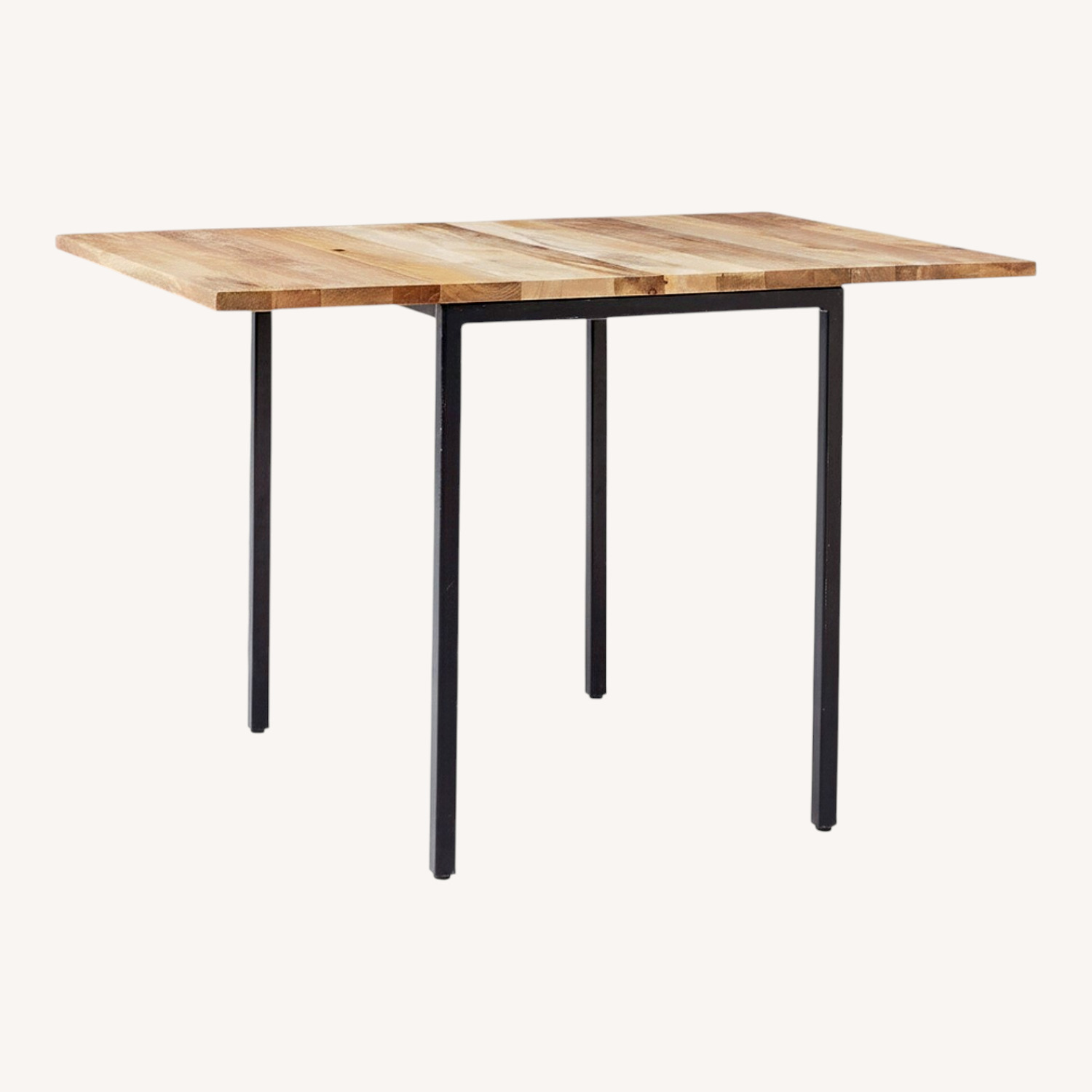 West Elm Product Description: Box Frame Solid Wood Top Dining Table Solid mango wood top. Dark Bronze-finished steel frame. Drop-down leaves swing up and are held in place by pull-out support bars underneath. Built-in levelers on legs with floor-protecting caps. Overall (collapsed): 24"w x 32"d x 30"h Overall (extended): 48"w x 32"d x 30"h Drop leaf length (each): 12" Tabletop thickness: 1" Clearance underneath: 28.75" Seats: 2–6 people
