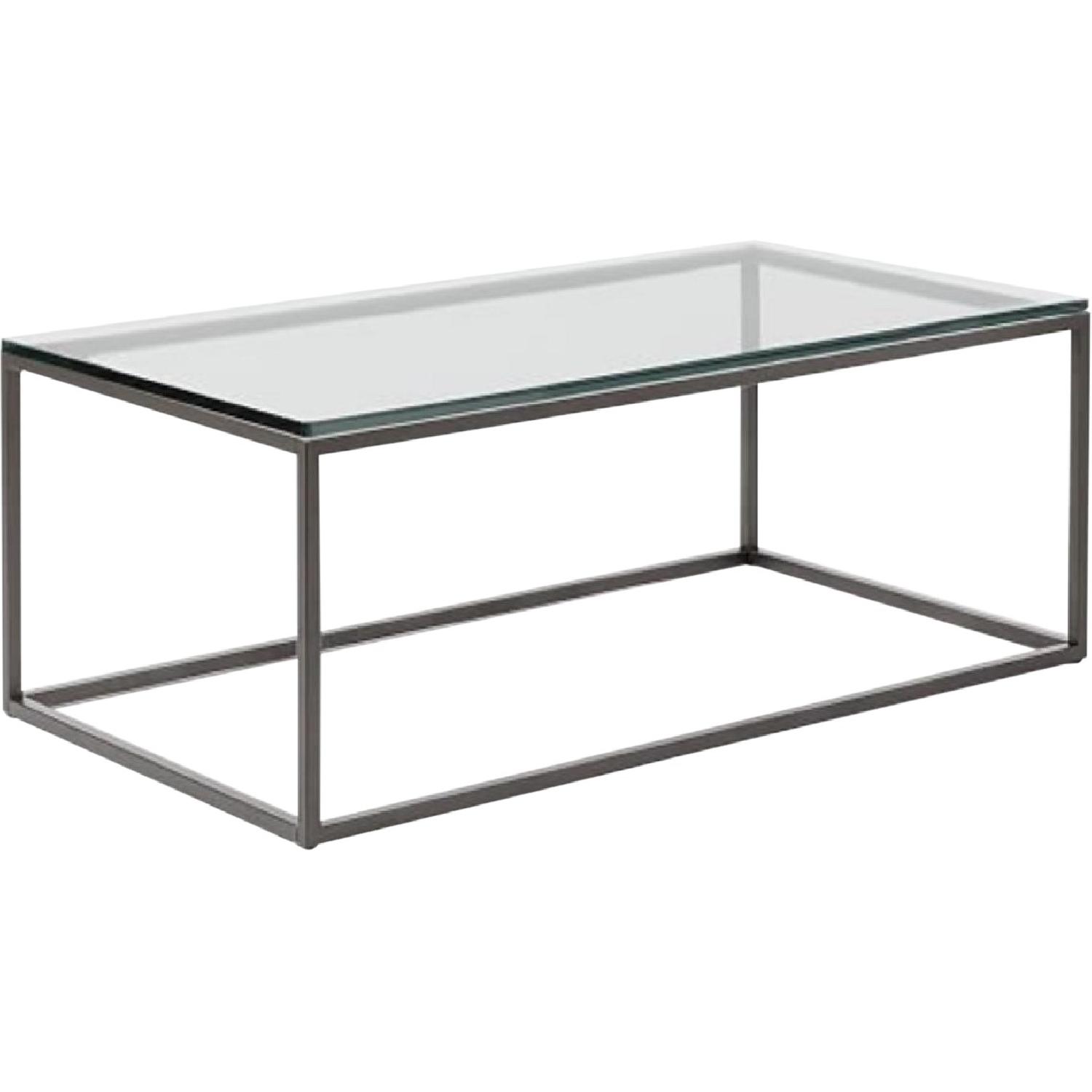 Seller's Notes:Clear-cut favorite. An easy fit with any style, the Box Frame Coffee Table's metal base is topped with a thick layer of clear glass. 44"w x 24"d x 18"h. Clear tempered glass top. Antique Bronze-finished steel frame. Imported.