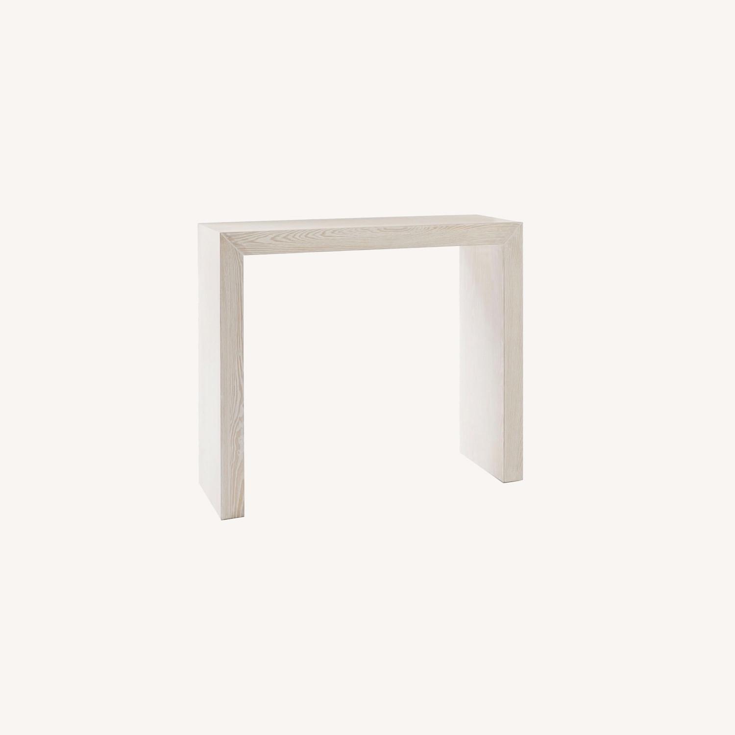 Seller's Notes:Inspired by its namesake, our Bridge Console Table flows seamlessly from top to sides like a waterfall, with a wire-brushed surface for added texture. Striking but minimal behind a sofa or in an entryway, it's also Contract Grade, meaning its extra durable. KEY DETAILS 36"w x 12"d x 30"h. Solid wood frame. Ash veneer over engineered wood top & sides. All wood is kiln-dried for added durability. Covered in a water-based Winter Wood finish. GREENGUARD Gold Certified. Meets or exceeds stringent chemical and VOC emissions standards. Legs feature adjustable levelers to adapt to varying floor levels. Brand New and still in the box sealed