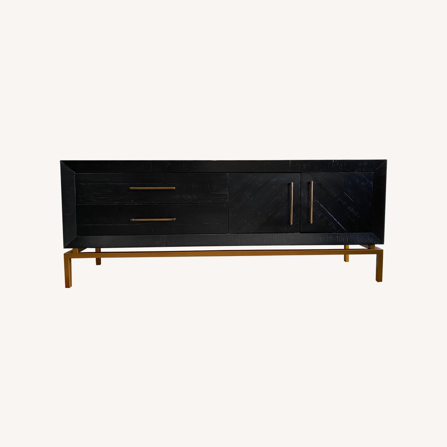 Seller's Notes:We bought this console from West Elm for $1400 in 2021. It's part of the Alexa series. It's sturdy and durable, made from solid wood, but the paint tends to chip. There are chipped blemishes in multiple spots, primarily noticeable on the top surface. We've been hiding them with black rubber placemats so haven't felt the need to repaint. All of the hardware works. Here are other details from the site: Solid acacia wood with a Burnished finish. Metal base and hardware in an Antique Brass finish. Accommodates a flat screen TV up to 64"w with a maximum weight of 130 lbs. Two drawers on wooden glides. Two doors open to reveal interior shelf (fixed). Cutout openings at back for cord management.