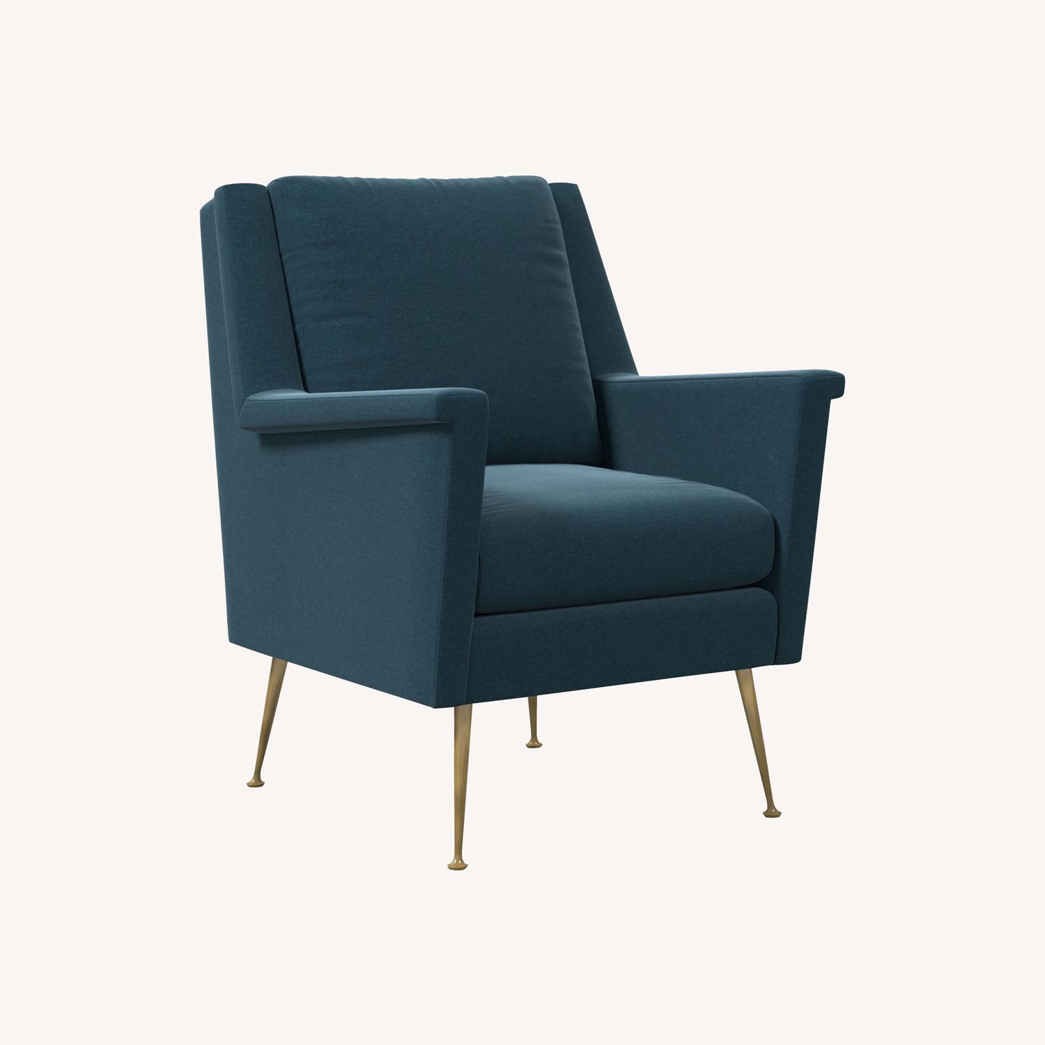Seller's Notes:Color is Petrol, in a performance velvet fabric. Has a small tear on the corner of the right arm. Brass legs.