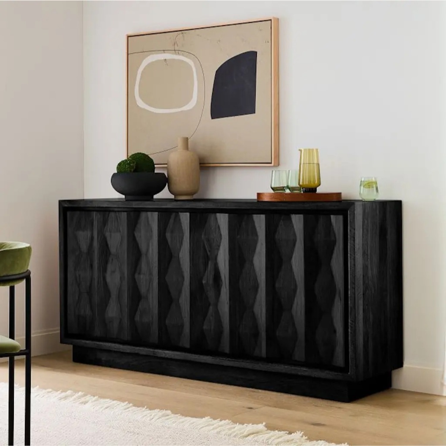 Seller's Notes:West Elm Carved Pattern Buffet Sideboard Credenza Floor model from West Elm store with barely visible wear and tear. Too big for current apartment. Details: Kiln-dried solid mango wood frame and base. The mango wood used on this product is sustainably sourced from trees that no longer produce fruit. 4 doors open to 2 cabinets with 2 adjustable shelves in each cabinet. This contract-grade item is manufactured to meet the demands of commercial use in addition to residential.