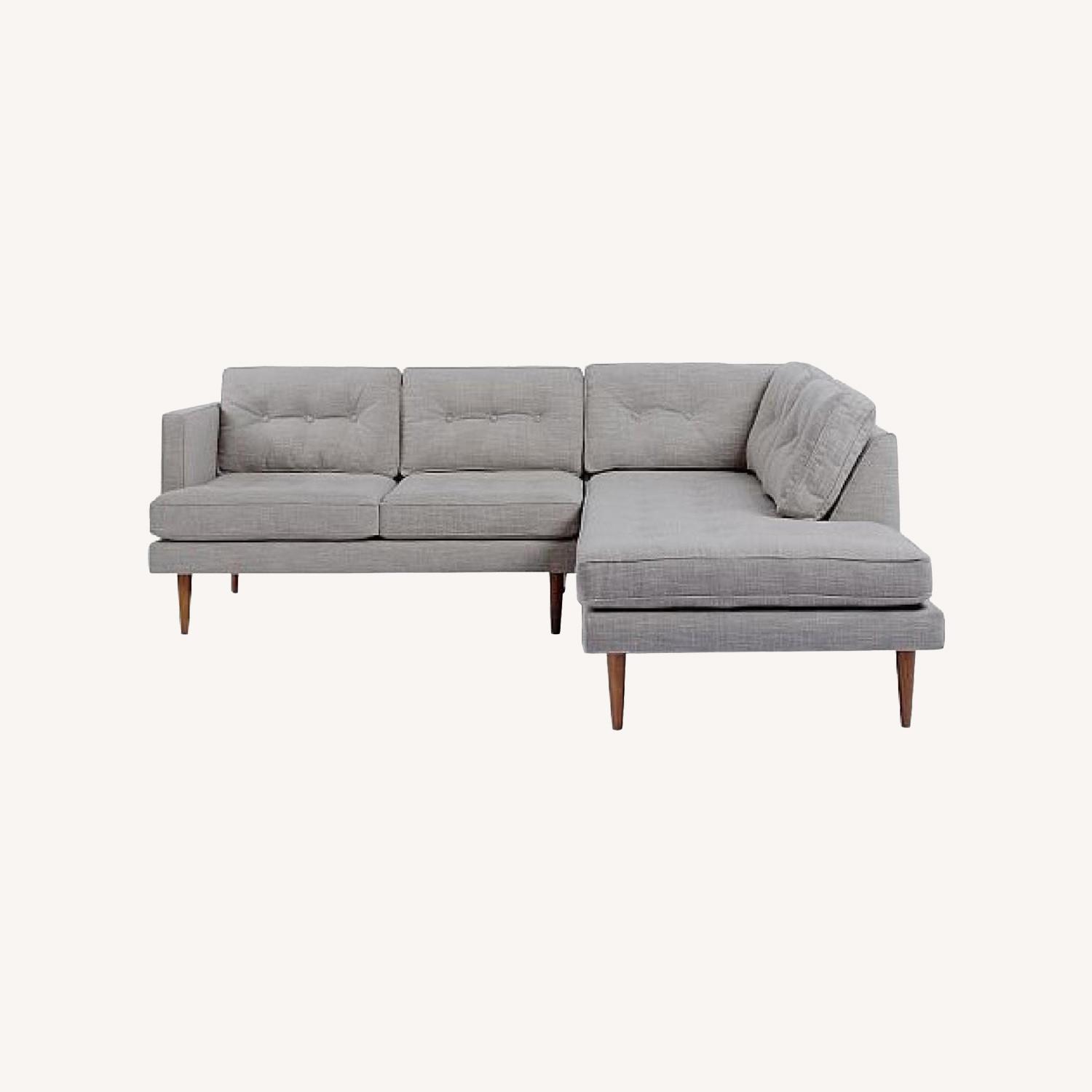 Seller's Notes:Selling my this mid-century modern coach by West Elm. It is a two-piece chaise sectional, with the chaise removing from the side with the armrest. It is an incredibly neutral "heathered crosshatch feather grey" fabric with tapered, pecan-stained solid wood legs. It has a tufted back and removable seat cushions. Buttons have come loose and have been re-sewn. There is some discoloration. 91.5"w x 83.5"d x 34"h. Hand-built frames with hand-finished upholstery. Solid wood legs in Pecan finish. Assembled in the USA.