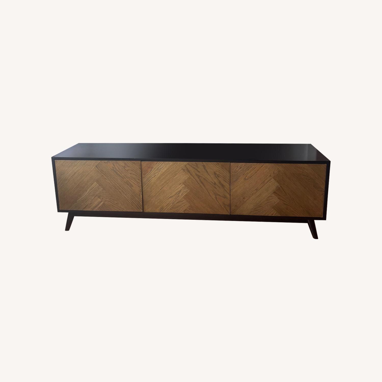 With chevron-patterned oak paneling and sleek, angled legs, our Chevron Oak Media Console stores everything from magazines to remotes, without sacrificing style. Its mid-century doors open up to reveal five convenient media cutouts for cords, making it perfect for speakers, Wi-Fi routers and TVs.