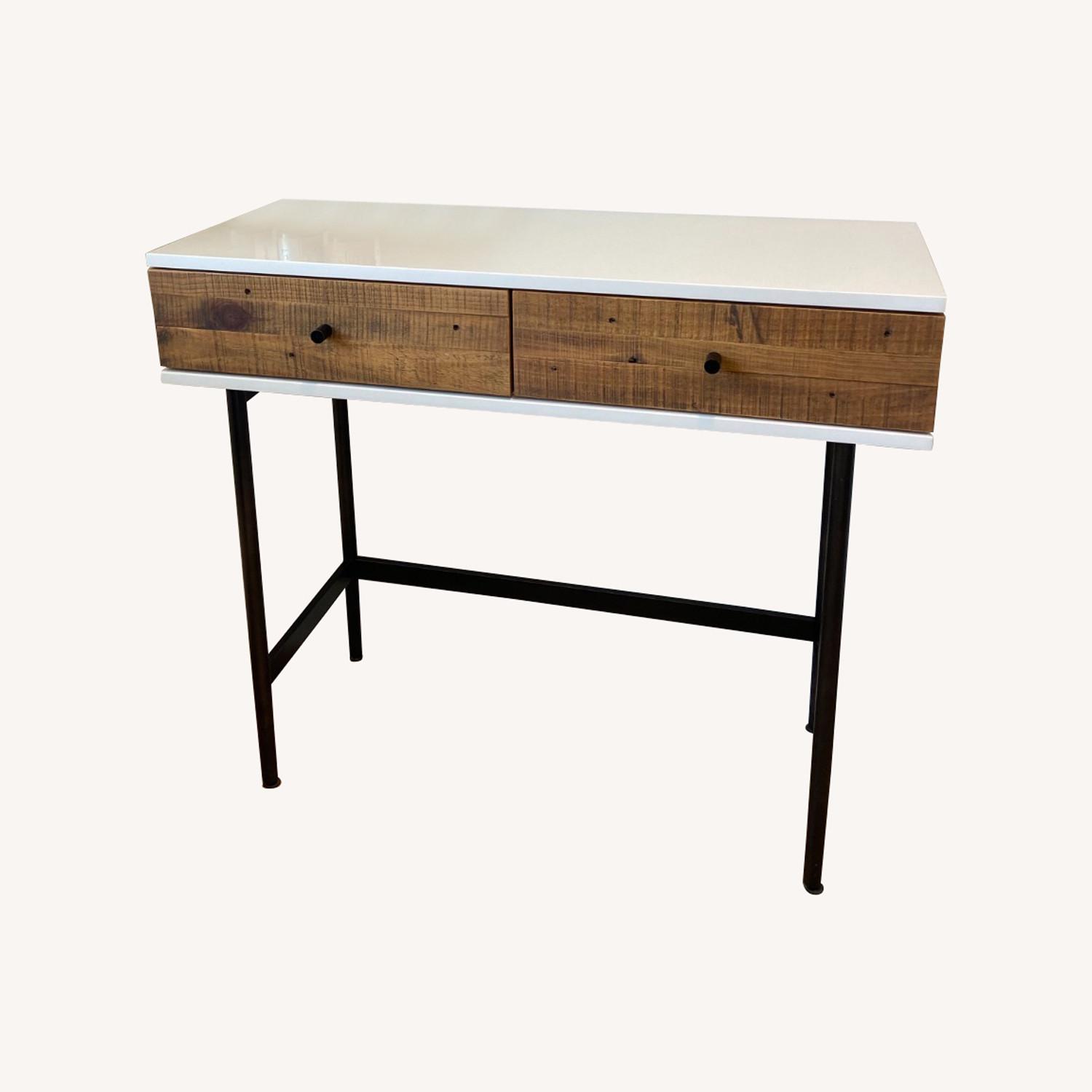 Seller's Notes:Best of both worlds. Town meets country on our Reclaimed Wood & Lacquer Console, framing rustic pine in a sleek lacquer frame. The wood comes from solid pine shipping pallets, reinvented into unique storage pieces for the home. Details Drawers open on smooth metal glides. Reclaimed pine wood drawer. Engineered wood case with glossy White lacquer finish. Brass plated drawer pull and metal legs in Antiqued Bronze finish.