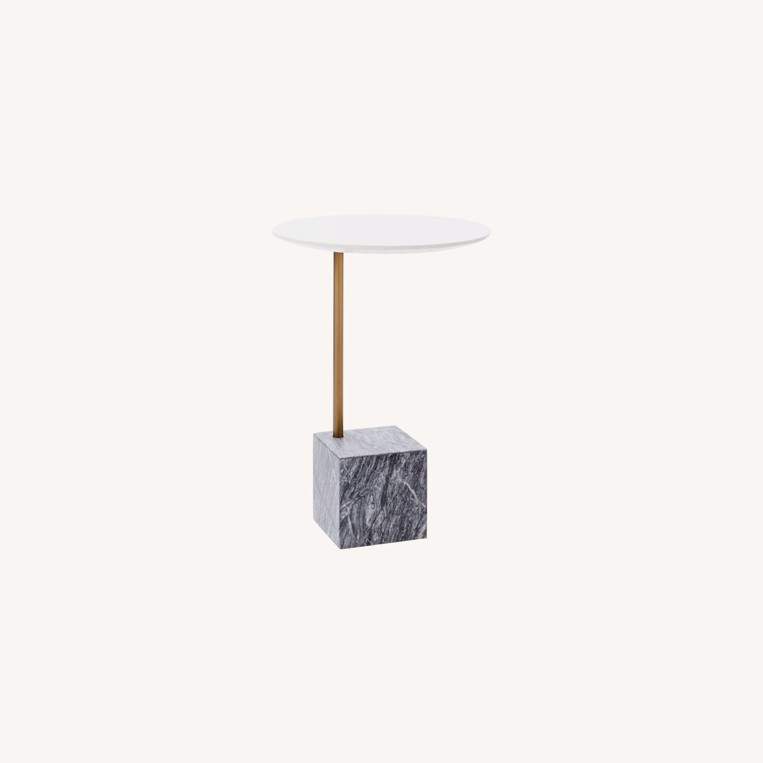Seller's Notes:With its veined marble base and thin metal stem, our Cube C-Side Table blurs the lines between sculpture and functionality. Its slim design allows you to pull it close to a sofa or chair, offering a handy landing spot for drinks or a book. 15.5"diam. x 22"h. Lacquered veneer over an engineered wood top in White. Metal stem in an Antique Bronze finish. Gray marble base. Natural variations in the marble make each piece subtly unique. Imported. SKU : 4178641