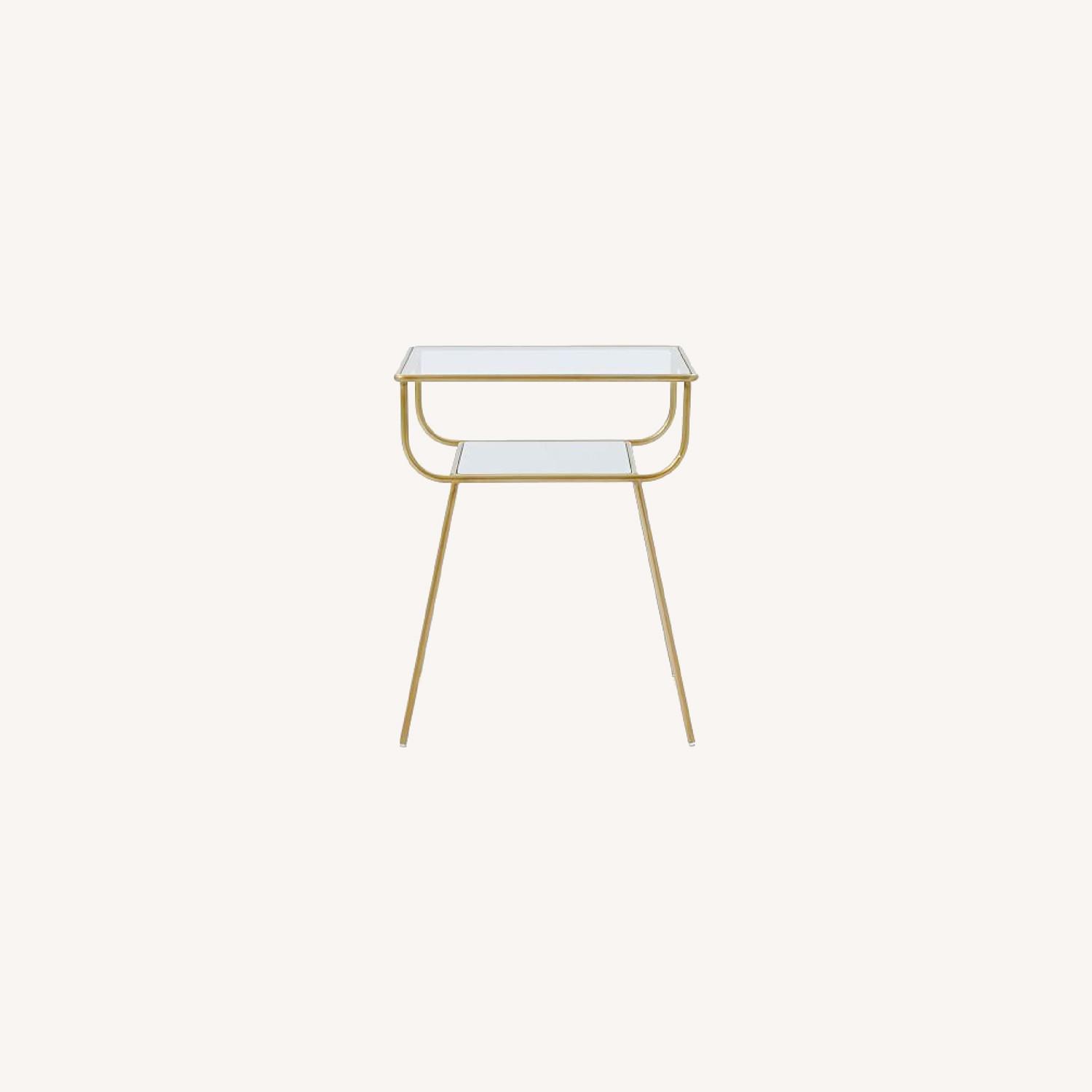 Seller's Notes:Tempered glass top. Mirrored glass shelf. Metal frame in an Antique Brass finish. Made in Indonesia.