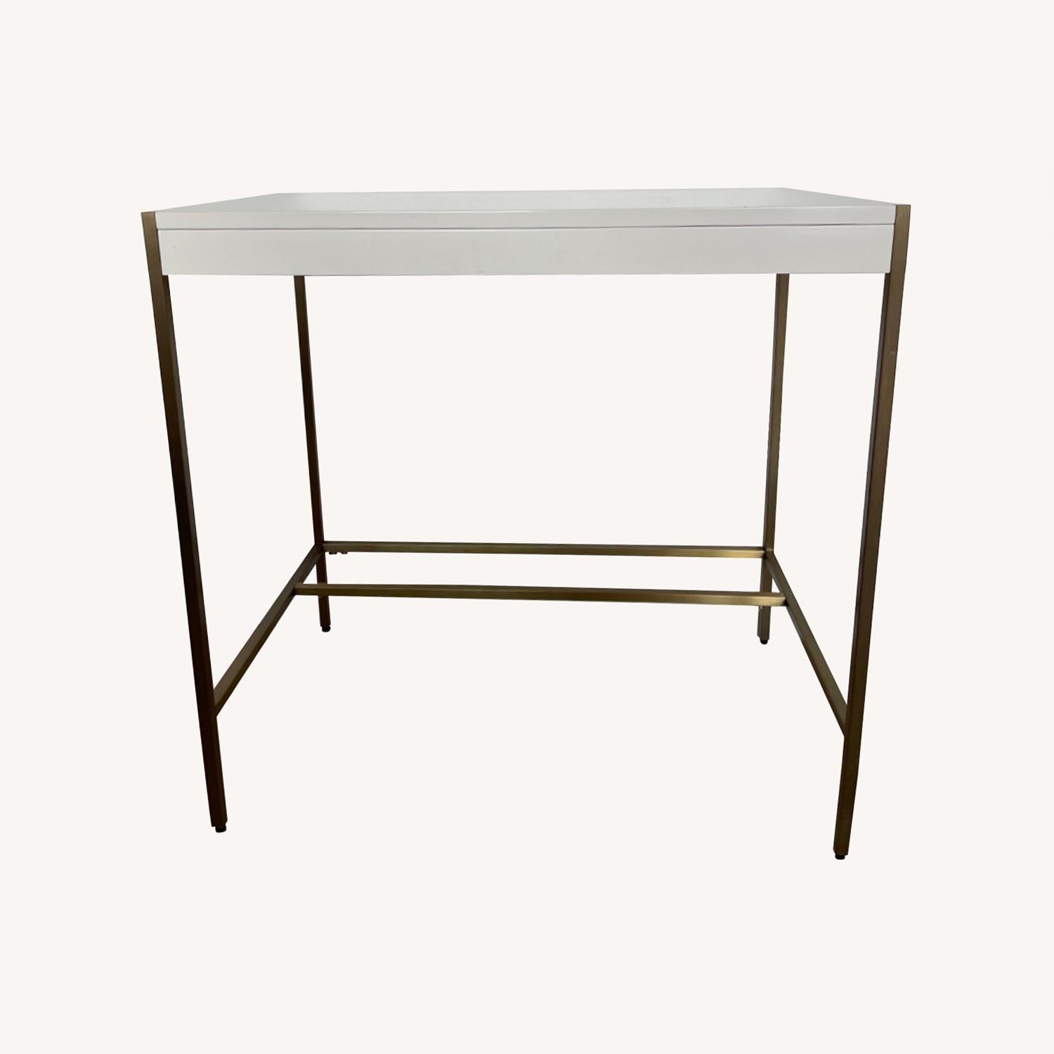 Seller's Notes:West Elm Zane mini desk * Solid & engineered wood in a White lacquer finish. * Stainless steel base in an Antique Brass finish. Dimensions: 30"w x 17.9"d x 29.5"h. Bought new for $479 a year ago. In great condition. One scratch as pictured. Its a beautiful solid piece with nice brass finishes.