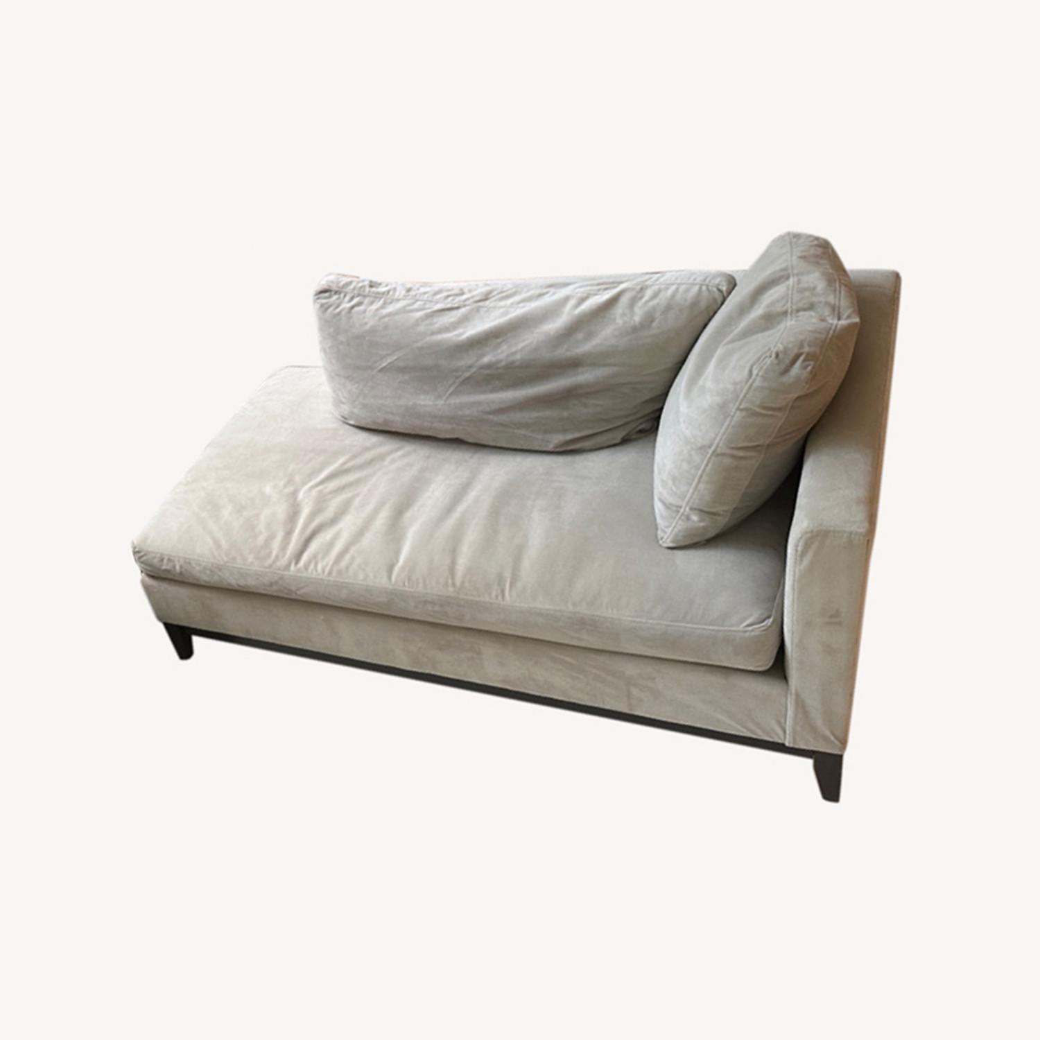 Seller's Notes:Two-seater left-arm chaise with removable side, back and seat cushions. Cushions are zippered for ease of removal. Velvet fabric and wooden legs. Neutral color and design enhances any decor style. Also seeking complementary three-seater sofa.