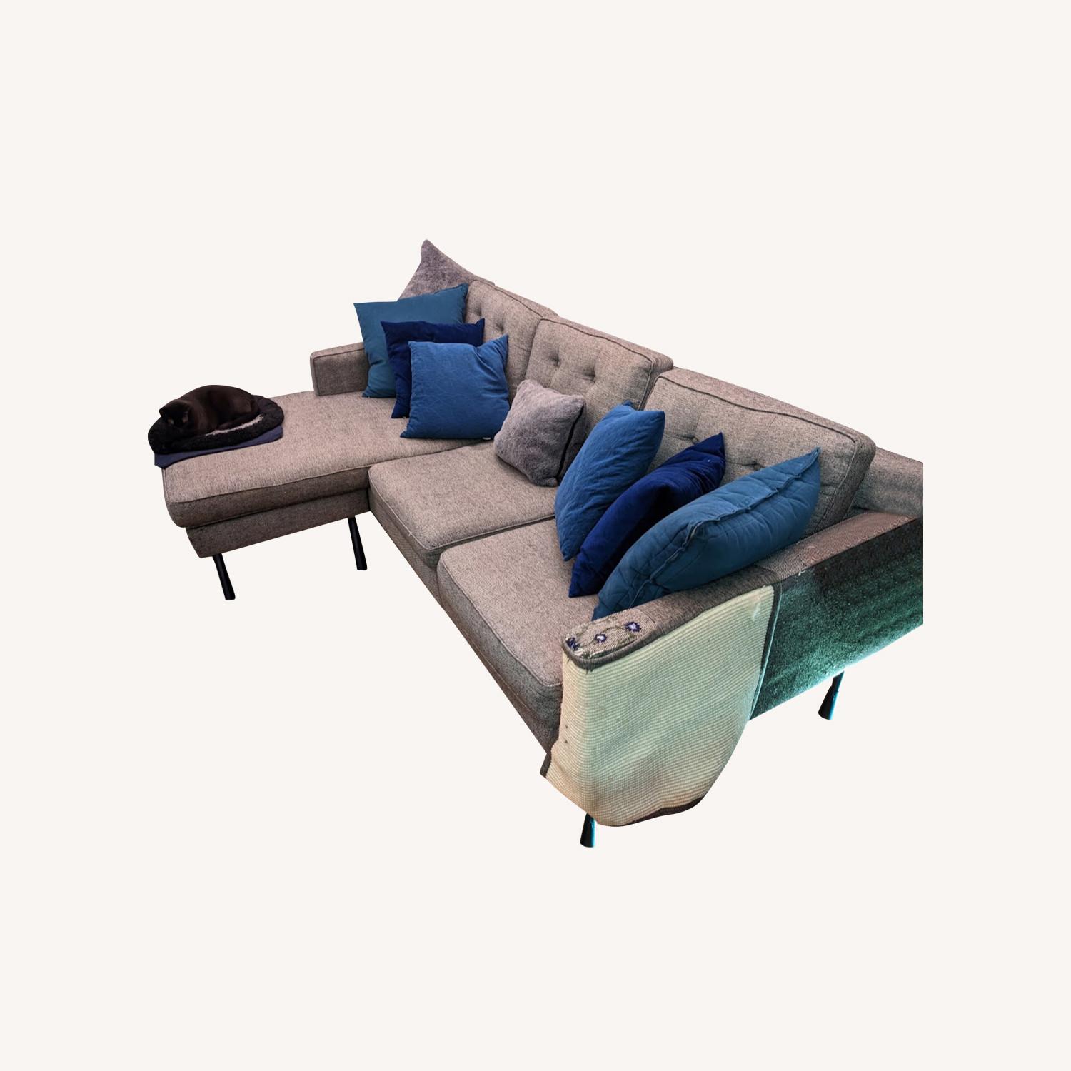 Seller's Notes:West Elm Drake 86" Mid Century Flip Sectional in Granite Twill. This has been a great couch for five years but can't make an upcoming move. Cushions solid. Minor damage (thread pulls) from cats over the years. No stains or smells. Custom legs and extensions we 3D printed raise the couch about 10" and widen the leg base to enable storage underneath. Original legs included as well. Pillows and other items in the photos not included - couch only.
