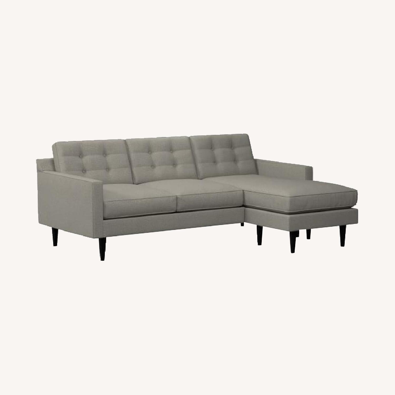 Seller's Notes:This couch is in great shape and is really functional! Not too large and very comfortable. There is normal wear and tear but is steam cleaned to make sure that it feels new. You can have the Chaise on either side of the sectional. This is the West Elm Drake Mid-Century Flip Sectional - Color: Pewter - Fabric: Chenille Tweed - 86"w x 62"d x 33"h. - Hand-built frames with hand-finished upholstery. - Solid oak and engineered hardwood frame with reinforced joinery. - Solid wood legs (removable). - High-gauge sinuous springs provide cushion support. - Seat cushions have fiber-wrapped, high-resiliency polyurethane foam cores. - Back cushions are foam and fiber filled. - Reversible cushions; seat cushions have zip-off covers. - Switch configuration from left to right with the freestanding ottoman and flippable chaise cushion.