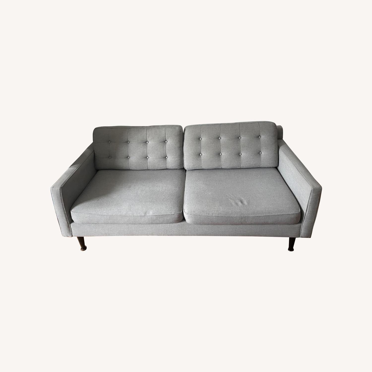 Seller's Notes:Beautiful West Elm Drake Sofa, bought from West Elm Store in Dumbo. In great condition and has only been used for 1 year. Details - Solid oak and engineered hardwood frame with reinforced joinery. - High-gauge sinuous springs provide cushion support. - Seat cushions have fiber-wrapped, high-resiliency polyurethane foam cores. - Seat firmness: On a scale from 1 to 5 (5 being firmest), it's a 4. - Back cushions are foam and fiber filled. - Reversible cushions (Astor Velvet excluded); seat cushions have zip-off covers. - Solid wood legs (legs are removable). - Made in Ukraine.