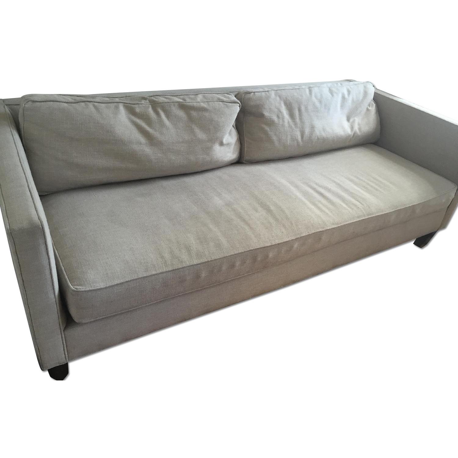 Seller's Notes:Stylish and cozy West Elm down-filled sofa in great condition. Two years old, no damage, couple of stains that will come out easily with cleaning. From West Elm description: The details make the Dunham. A deep bench-style seat, tuxedo-style shape, tailored welting along every edge and premium down-wrapped cushions make this sofa feel every bit as lavish as it looks. Solid wood frame; solid wood legs with Chocolate-stained finish. Back cushion: down and poly blend. Seat cushion: foam core wrapped in down and poly blend. Loose back and bench cushions feature welted trim. Hand-built frames with hand-finished upholstery. Removable legs and box cushions. 7 in clearance under sofa.