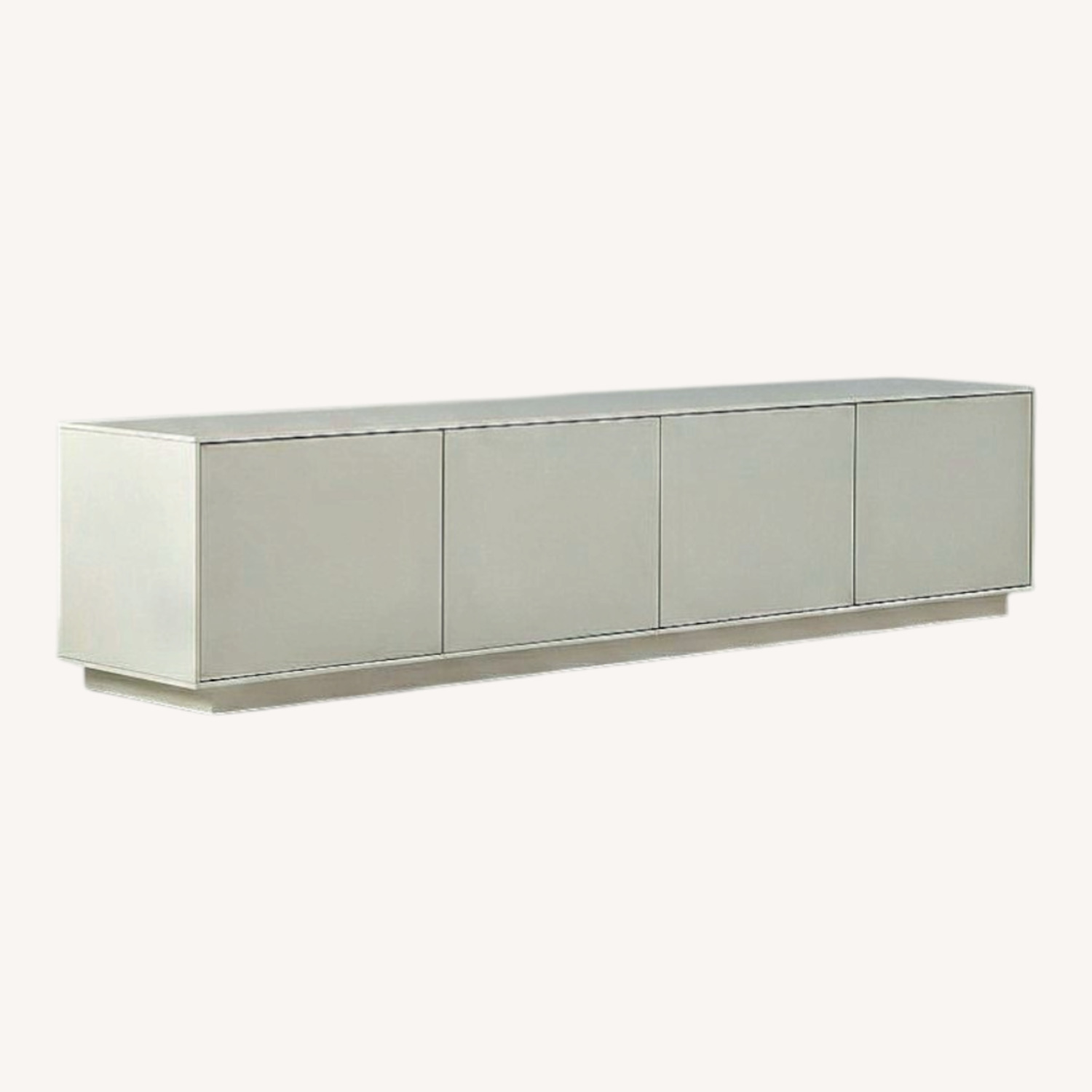 Seller's Notes:West Elm Emilia 80 inch media console with wire porta. Color is haze (gray) in glossy lacquer. Glass mirror cabinet doors.