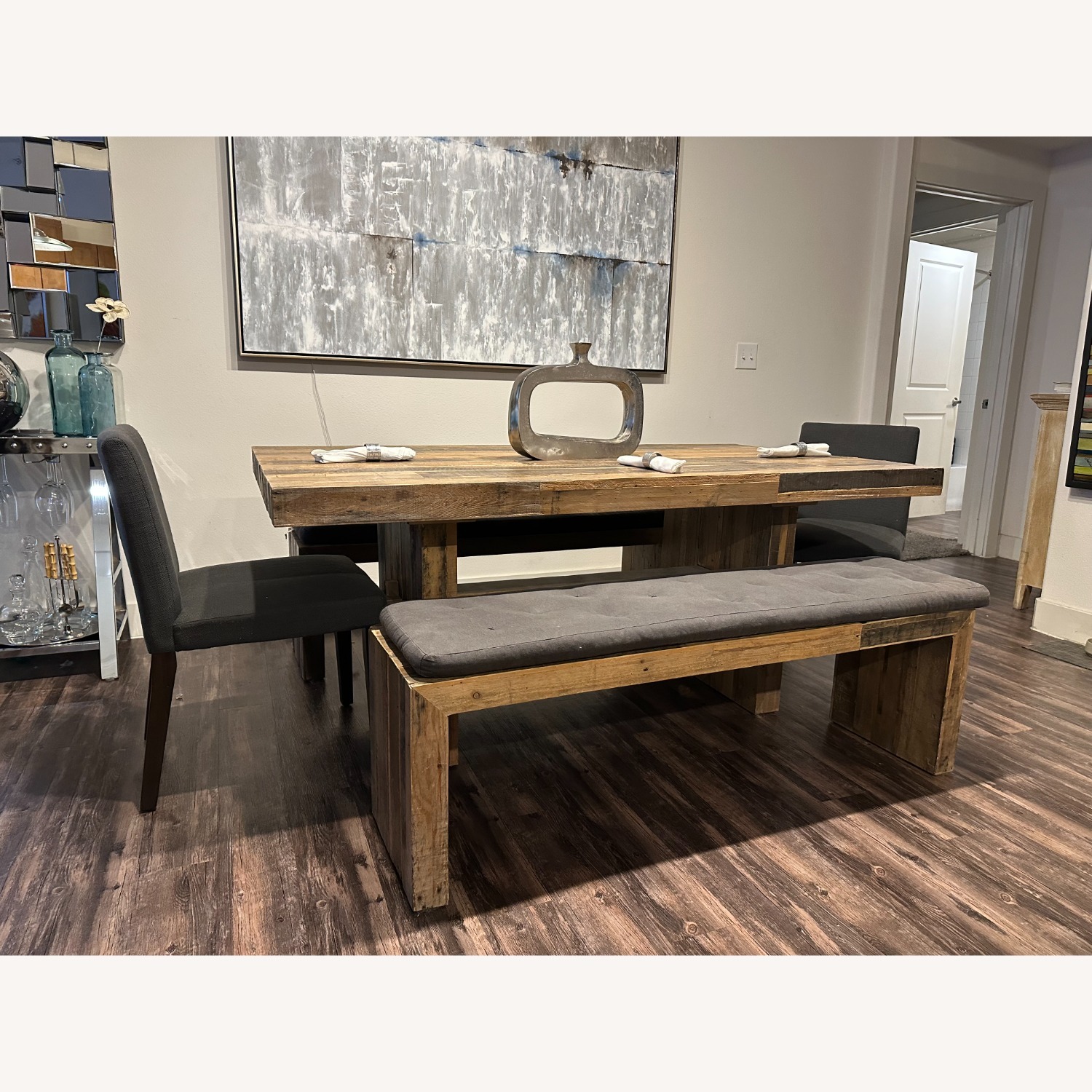 Seller's Notes:72 table made of reclaimed wood, retail $1599, two (2) dining benches retail ($599 ea) *The two chairs are not included* Seats 6-8 comfortable. Was used for design and rarely used for dining, Awesome piece.