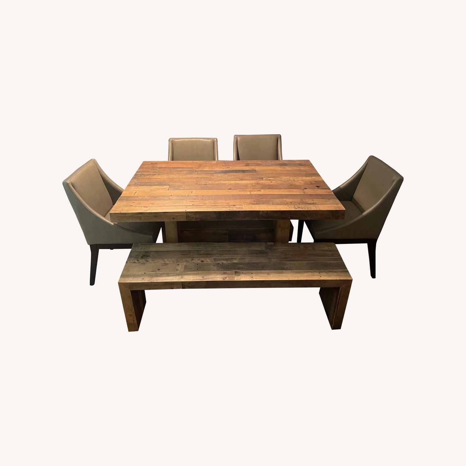 Seller's Notes:Emerson table and bench are solid reclaimed pine in a natural finish. The pine is recycled from shipping pallets and packing crates. Reclaimed pine has a rugged surface texture that softens with age and use. Four leather dining chairs accompany for plenty of seating and entertainment for the holidays!