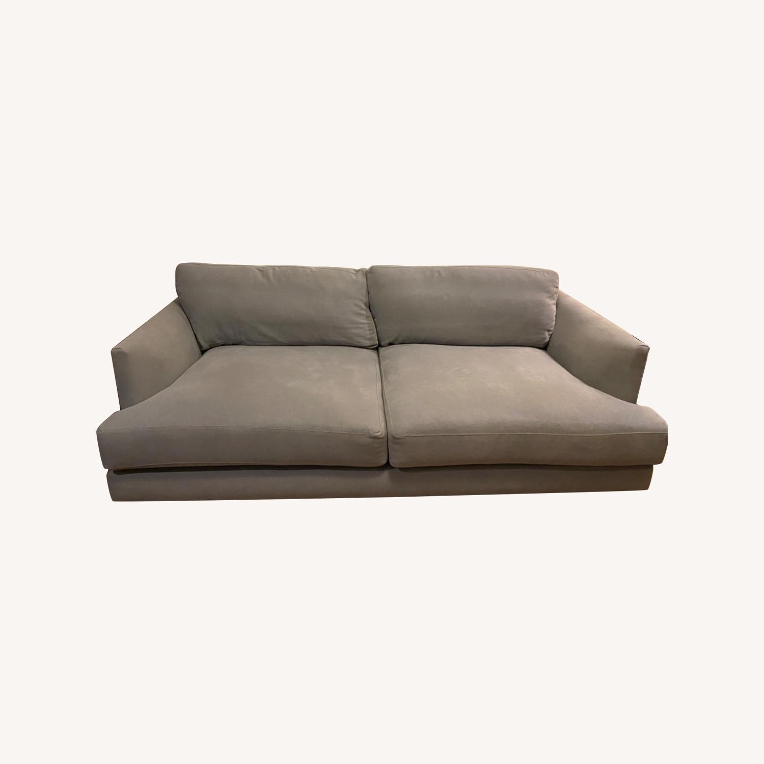 Seller's Notes:This sofa has a deep, comfy seat and low, padded arms give it an incredible sink-right-in quality that's perfect for the whole family. It is Performance Wash Canvas in Feather Gray and is 100% Cotton. Seat firmness is soft. On a scale from 1 to 5 (5 being firmest), it is rated a 2. Loose, reversible cushions that have removable covers. We have owned it for a year only and are only selling because we are moving out of town! It’s in great condition - very minor discoloration due to the canvas material however it totally fits with the aesthetic in my opinion.