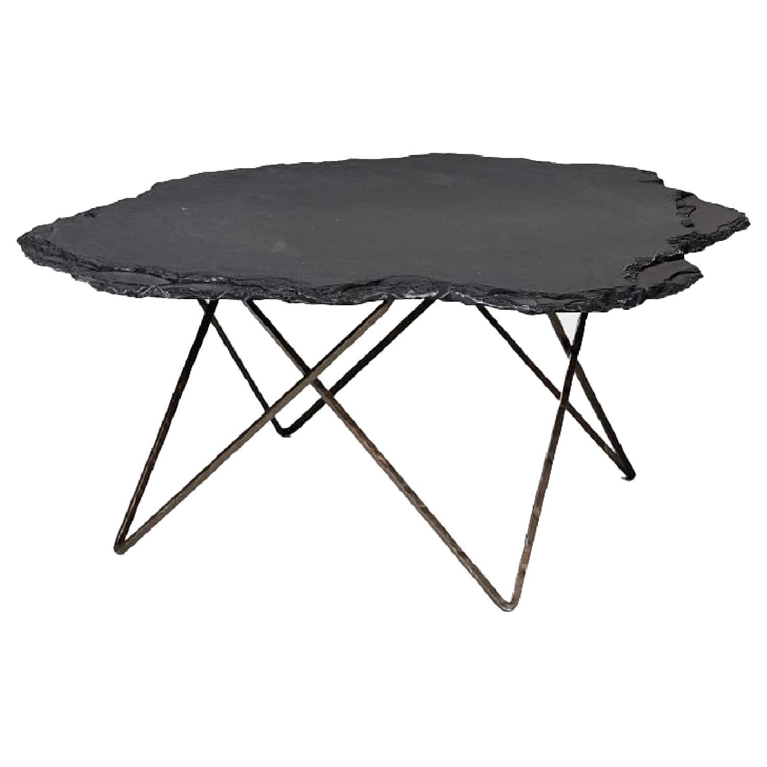 Material: Slate tabletop with iron base — the stone slab top is cut by hand, resulting in unique natural variations.Style: Modern / organic with stone surface and minimal metal support.