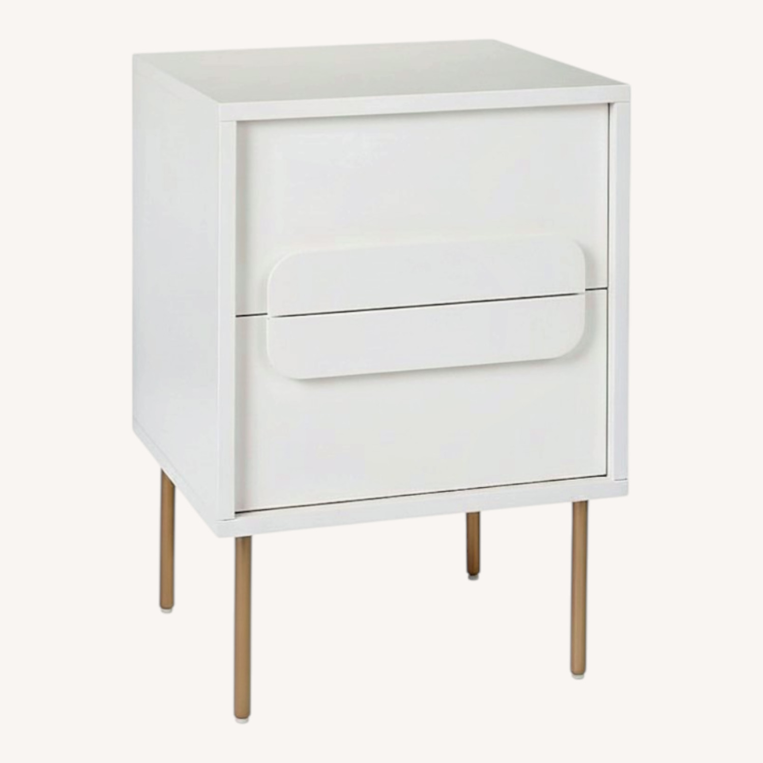 Seller's Notes:West Elm Gemini Nightstand - White Lacquer Circular overlays on our 70s-inspired Gemini Nightstand function as both design detail and streamlined drawer pulls. It's made of sustainably sourced wood covered in a white, water-based lacquer finish and set on slender metal legs. Bedroom storage doesn't get much chicer than this. 18"w x 15"d x 25.5"h. Solid and engineered wood. All wood is FSC®-certified. Covered in a water-based White lacquer finish. GREENGUARD Gold Certified. Meets or exceeds stringent chemical and VOC emissions standards. Metal legs in a Light Bronze finish. 2 drawers open on metal glides. Made in Vietnam.