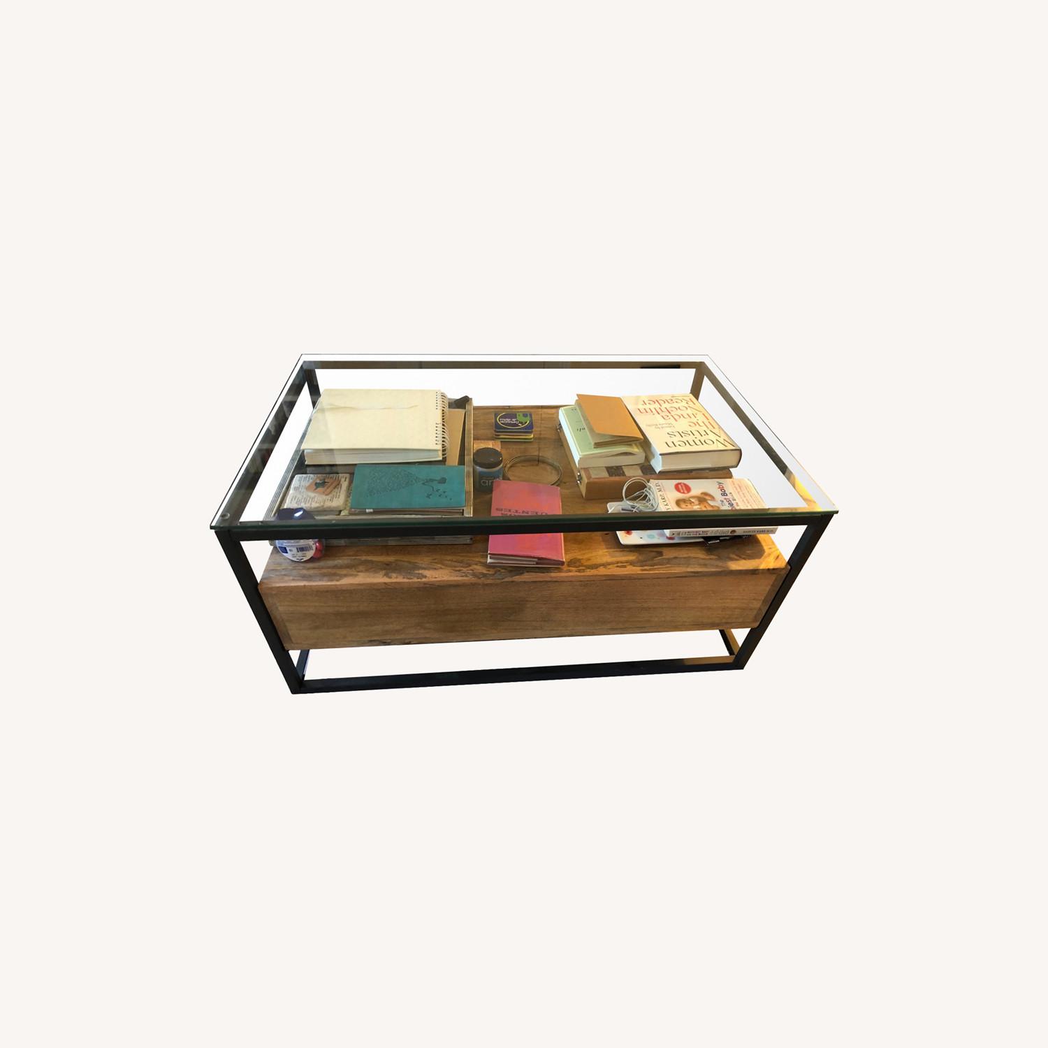 Seller's Notes:Glass top coffee table with plenty of storage, 2 years old with minor wear on the glass. All together weighs about 70 lbs., retails for $599: https://www.westelm.com/products/box-frame-storage-coffee-table-h2262/?pkey=s%7CBox%20Frame%20Storage%20Coffee%20Table%7C18