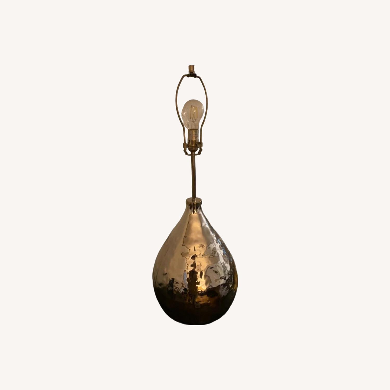 Seller's Notes:West Elm Hammered Metal table lamp in shiny silver color. Lamp shade not included. Use 3 way bulb for different vibrancy of light. Great statement piece to use on console table or bedside light.