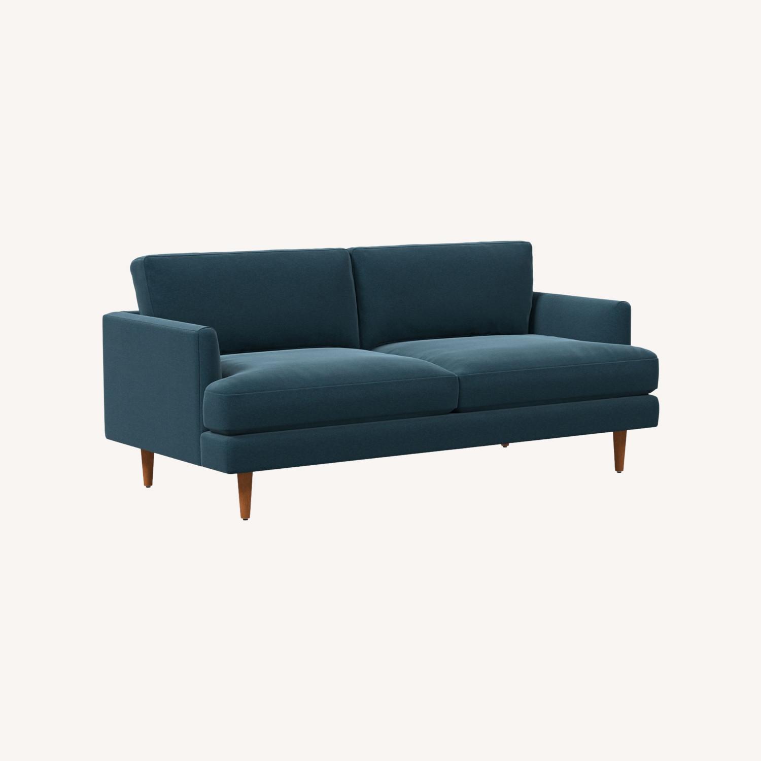 Seller's Notes:Velvet Petrol Pc Hand-built frames with hand-finished upholstery. Engineered hardwood frame with mortise & tenon joinery. Rubberwood legs in a Pecan finish. All wood is kiln-dried to prevent warping. High-gauge sinuous springs provide cushion support. Seat cushions have down alternative-wrapped, high-resiliency polyurethane foam cores. Seat firmness: Soft. On a scale from 1 to 5 (5 being firmest), we rate it a 2. Back cushions are filled with a down alternative and poly fiber blend. Cushions are reversible (Astor Velvet excluded). Removable legs feature adjustable levelers to adapt to varying floor levels. Assembled in the USA.