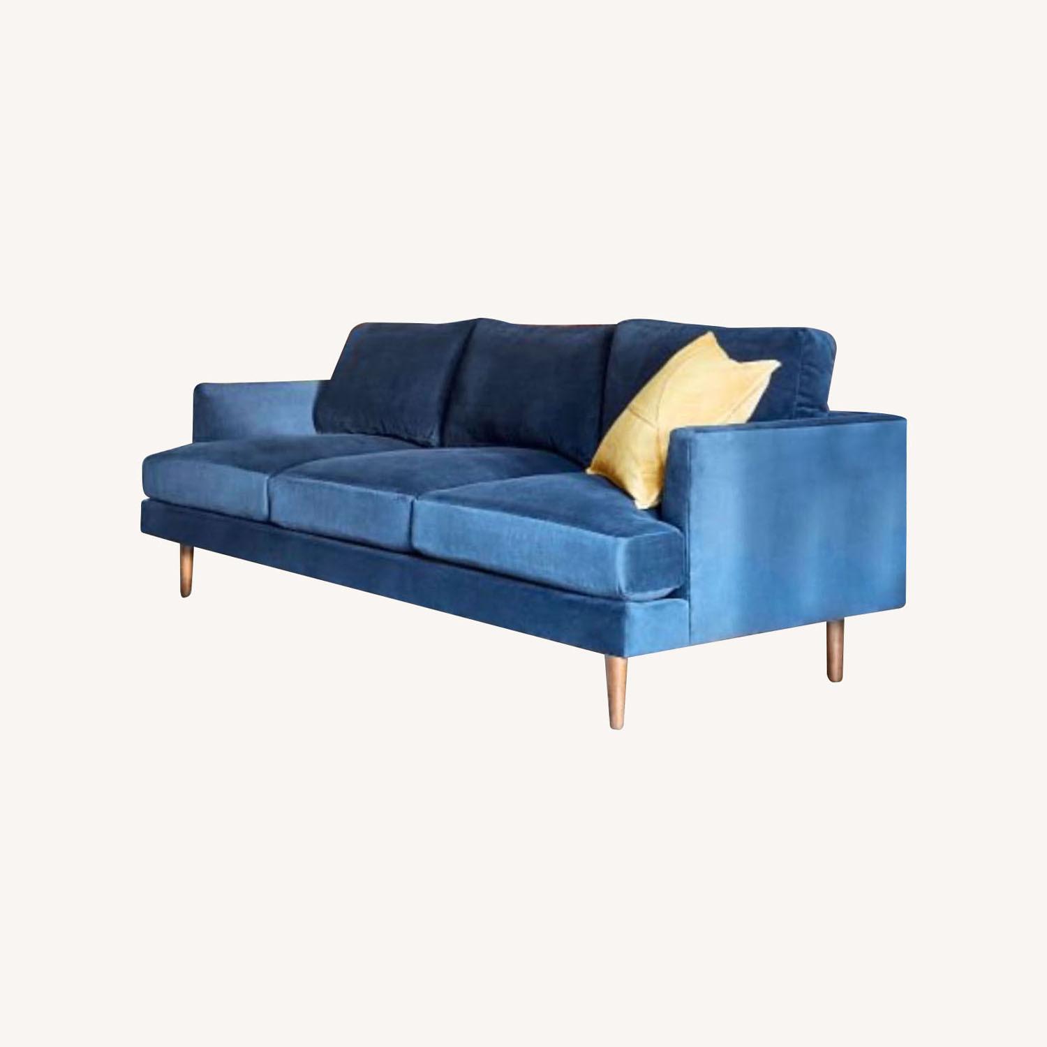Seller's Notes:Brand new (2 days old) West Elm Ink Blue Performance Velvet Haven Loft Sofa. Tapered real wood removable legs. Beautiful and brand new. Not too soft, not too hard. Engineered hard wood frame.