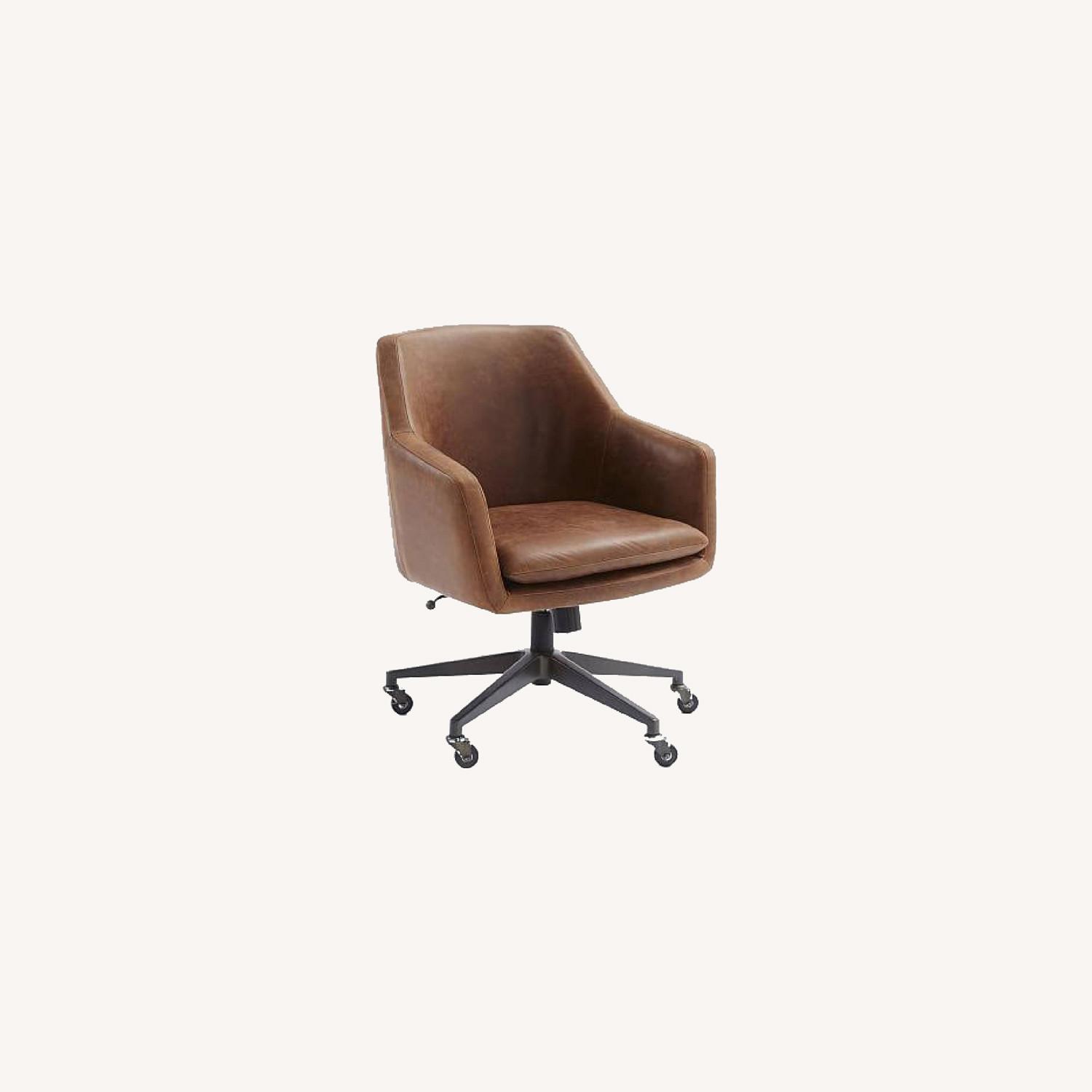 Seller's Notes:West Elm Helvetica Leather Swivel Office / Desk Chair Beautiful leather office chair, worn in with scratches - see photos - Metal base in antique bronze finish - Swivels and tilts, with adjustable tilt tension - Control seat height via a gas-lift mechanism Originally $699+ from west elm. Chair still available on website Non-smoking, pet free home