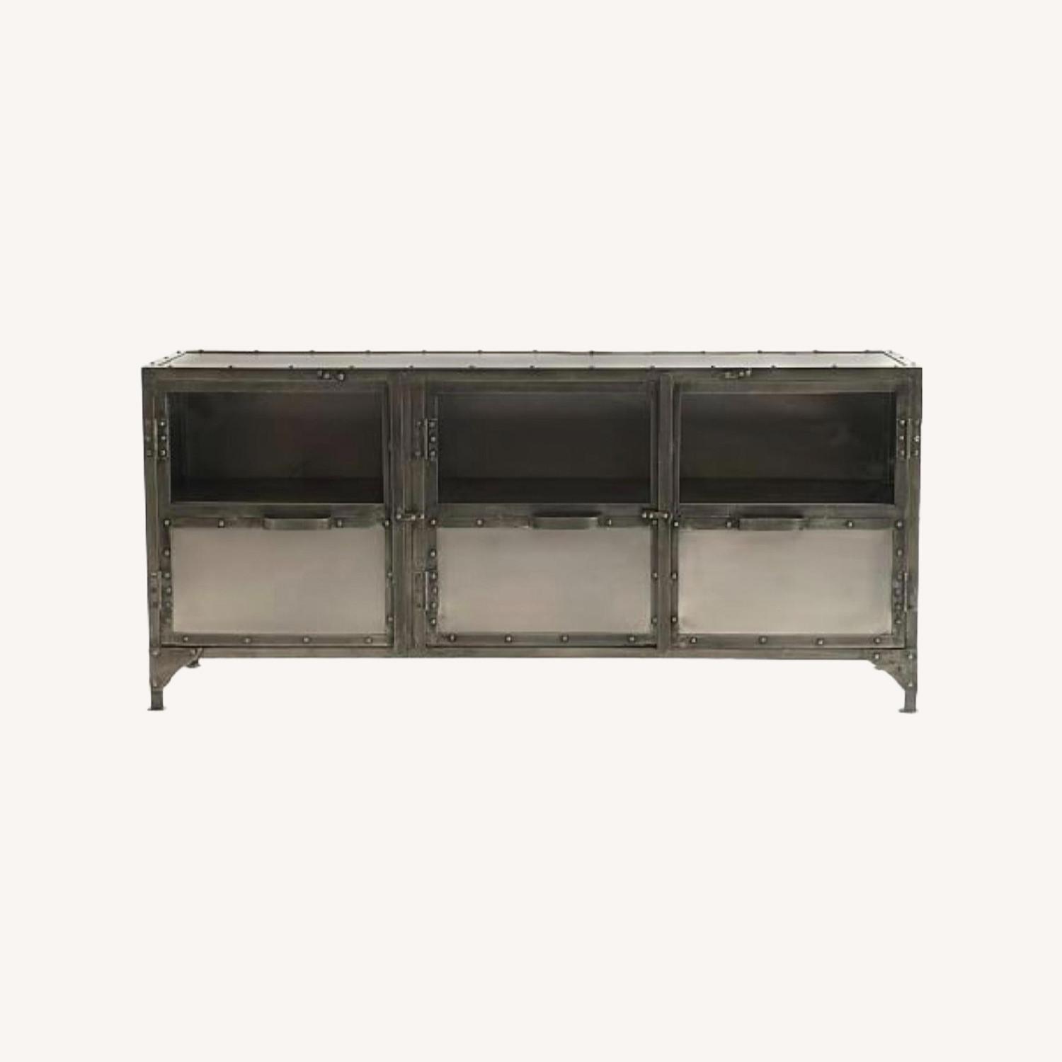 Seller's Notes:The West Elm industrial media cabinet we are selling is made with a light gray metal with dark gray iron trim and has an aged/distressed finish. We have used it for 7-8 years. The cabinet has three doors with glass windows on top and a shelf inside with two cord openings in the back wall of the frame. It is in good condition with the exception of a few blemishes and scratches (shown in the photos). Perfect for someone looking to add an industrial or metal piece/furniture to their home.