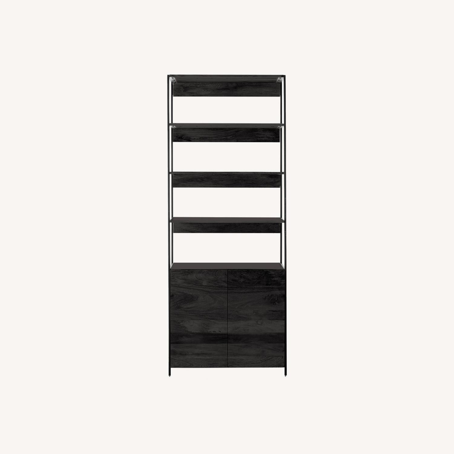 Seller's Notes:Floor model with some imperfections such as pictured in photographs. Shelves missing hardware which is attainable at hardware stores; scratch on top shelf under closed shelving and front left door a little misaligned. Solid mango wood. Blackened steel frames and legs. Four fixed shelves and one cabinet with three adjustable shelves. Finished on three sides. Cord cutouts on reverse. The mango wood used on this product is sustainably sourced from trees that no longer produce fruit. Made in India.