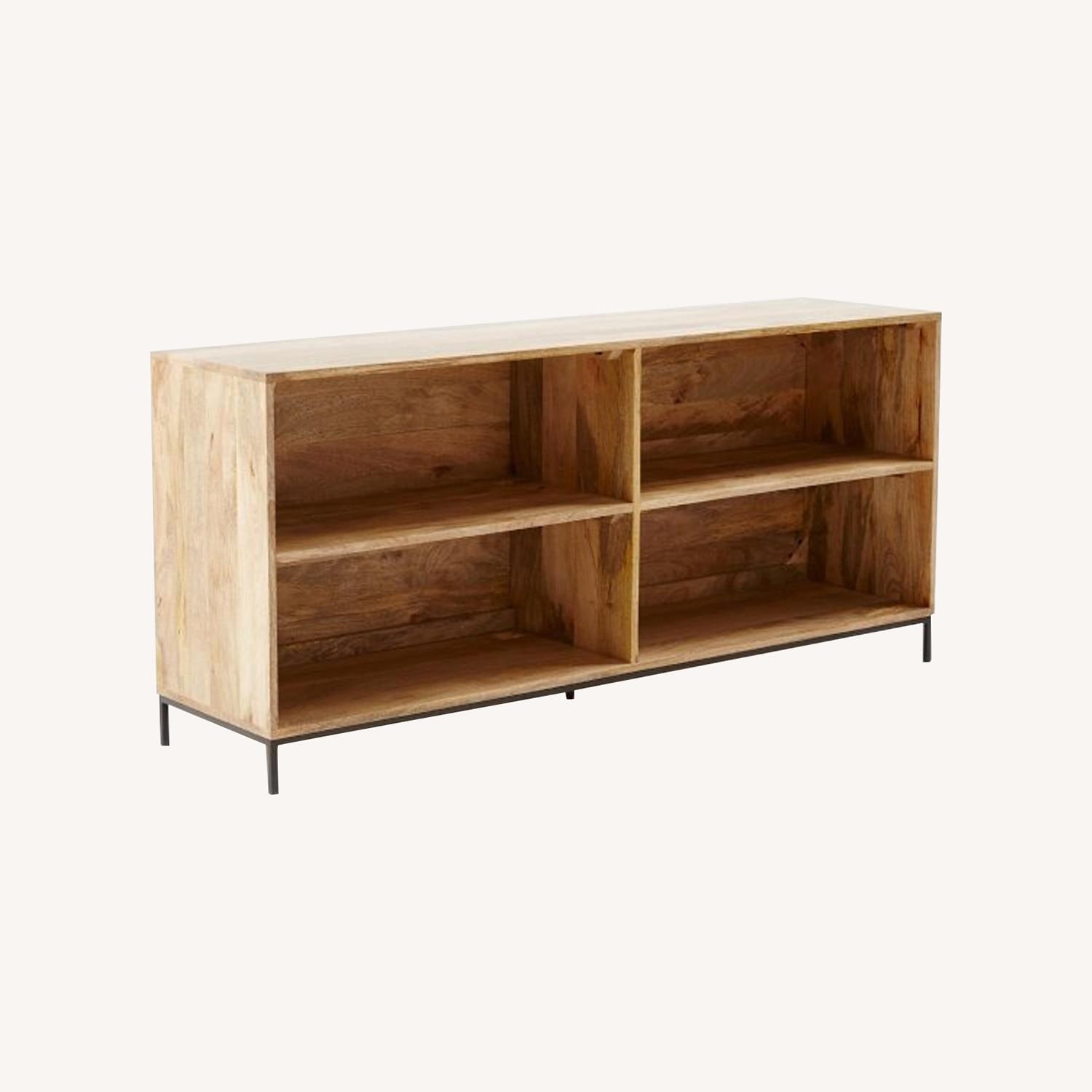 Seller's Notes:Mango wood bookcase that also works as a media console thanks to cord openings in bottom compartments! This is one of the first pieces of furniture I purchased following a cross country move and it was the perfect size for my space. Looks great with all other items in the Industrial collection. Minor discoloration on one small spot in the top right compartment (pictured), which is unlikely to be noticeable after placing items on the shelf.