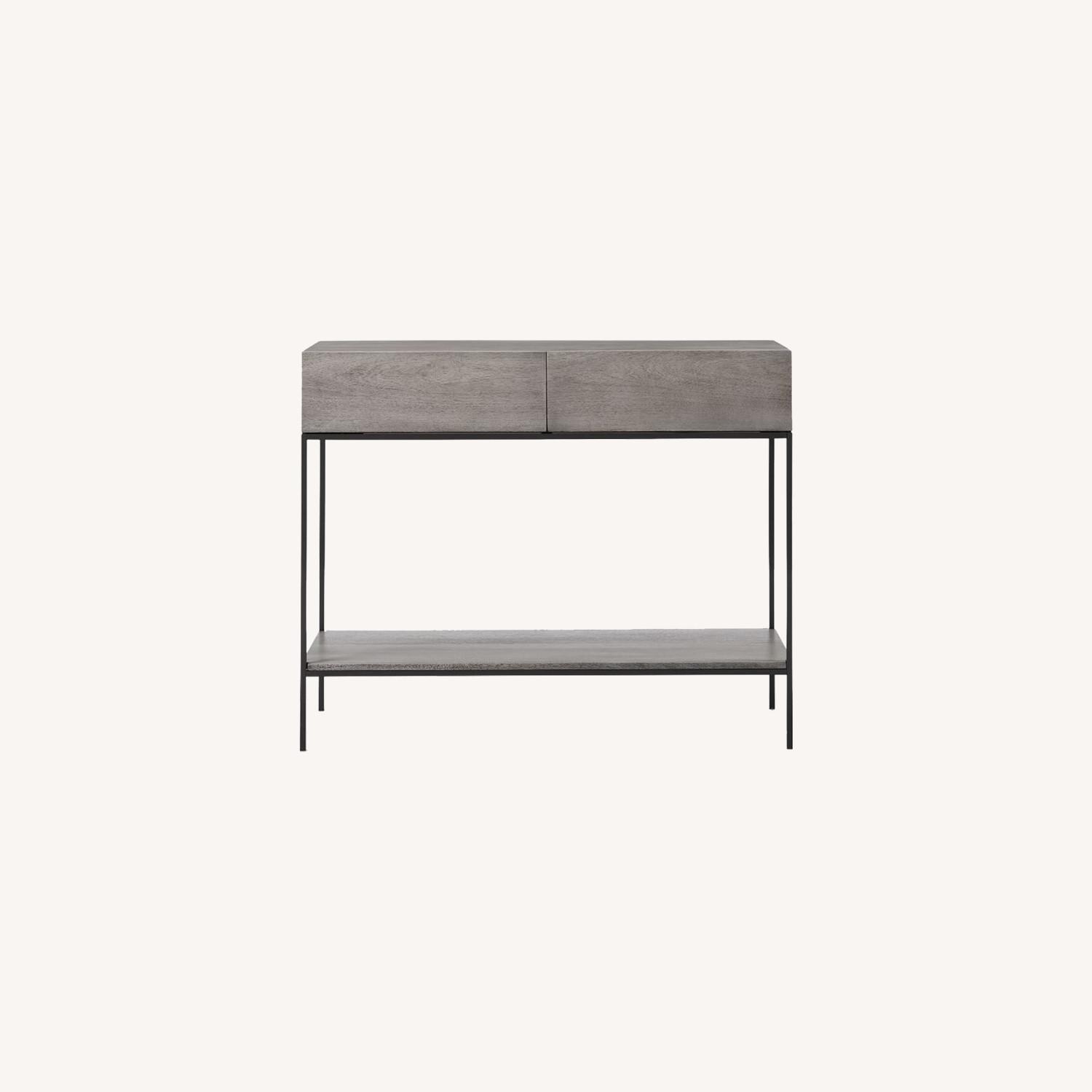 Seller's Notes:Raw Mango: Kiln-dried solid mango wood with a wax finish. Gray: Kiln-dried solid mango wood with a Gray finish. Steel legs. Natural variations in the wood grain and coloring are to be expected. The mango wood used on this product is sustainably sourced from trees that no longer produce fruit. Two drawers on wooden glides. Dimensions Overall: 42"w x 14"d x 34"h. Drawer (2): 17.5"w x 13"d x 6.5"h. Console bottom to shelf: 19". Clearance under shelf: 6.25". Max. weight capacity: 170 lbs.