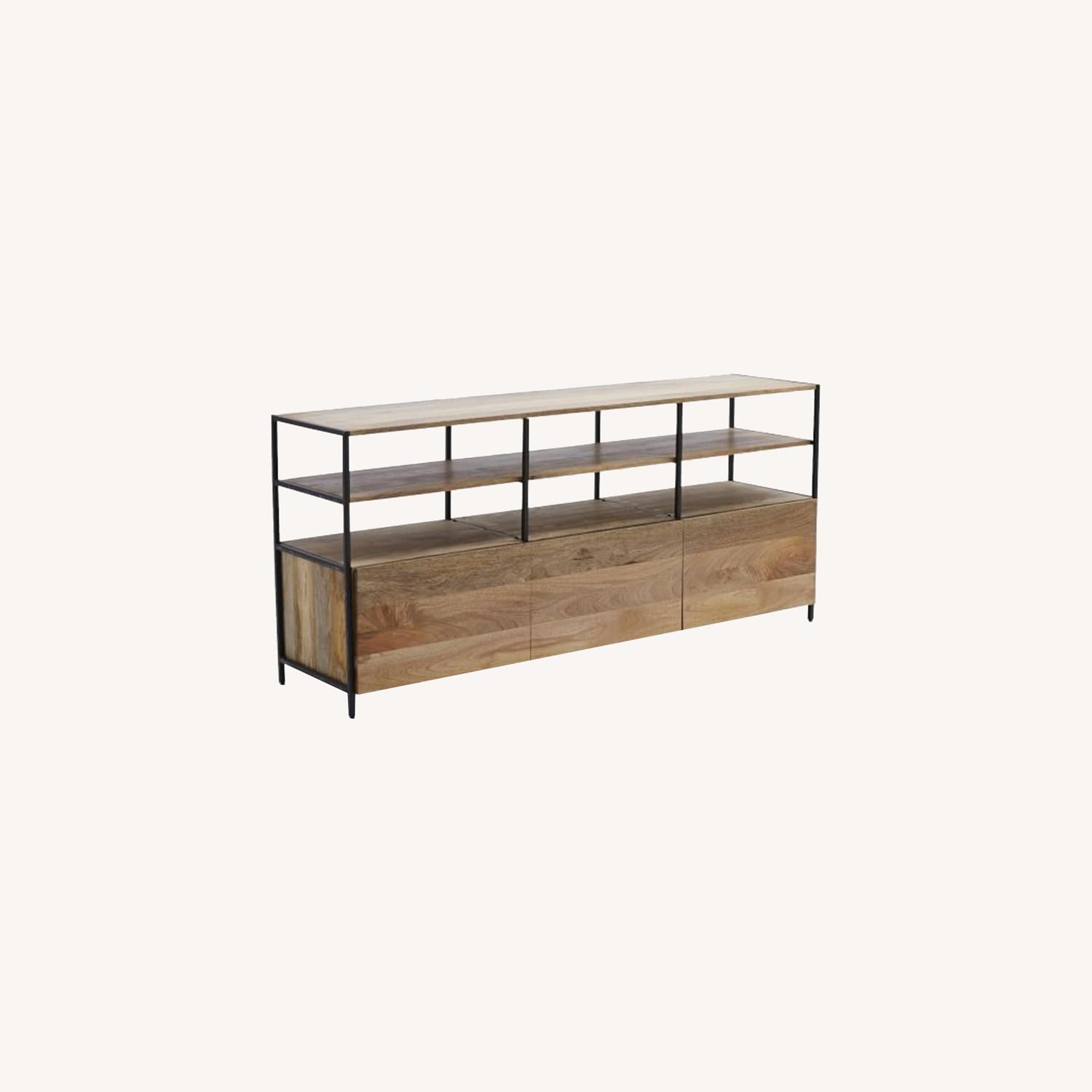 Seller's Notes:Made from richly-grained solid mango wood and supported by blackened steel frames, our Industrial Modular Storage Collection combines form, function and versatility. It offers plenty of media storage and shelving space, while its freestanding design means that you can easily pair it with other pieces in the collection to create a set that's right for you. The natural variations in mango wood make each piece subtly unique. KEY DETAILS 67"w x 17"d x 30"h. Solid mango wood with natural color variations. Blackened steel frames and legs. Pieces finished on all sides. Accommodates a flat screen TV up to 60"w with a maximum weight of 130 lbs. The mango wood used on this product is sustainably sourced from trees that no longer produce fruit. Made in India.