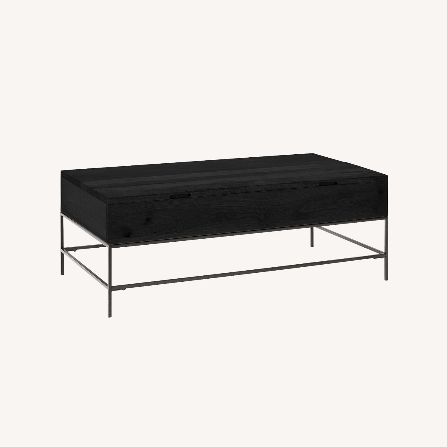 Seller's Notes:Black Blackened steel legs. Solid mango wood body. Natural variations in the wood grain and coloring are to be expected. Top door with pop-up mechanism reveals interior storage. Pop-up top doubles as a workspace or tabletop. The mango wood used on this product is sustainably sourced from trees that no longer produce fruit. Made in a Fair Trade Certified™ factory, empowering workers who made it. Made in India.