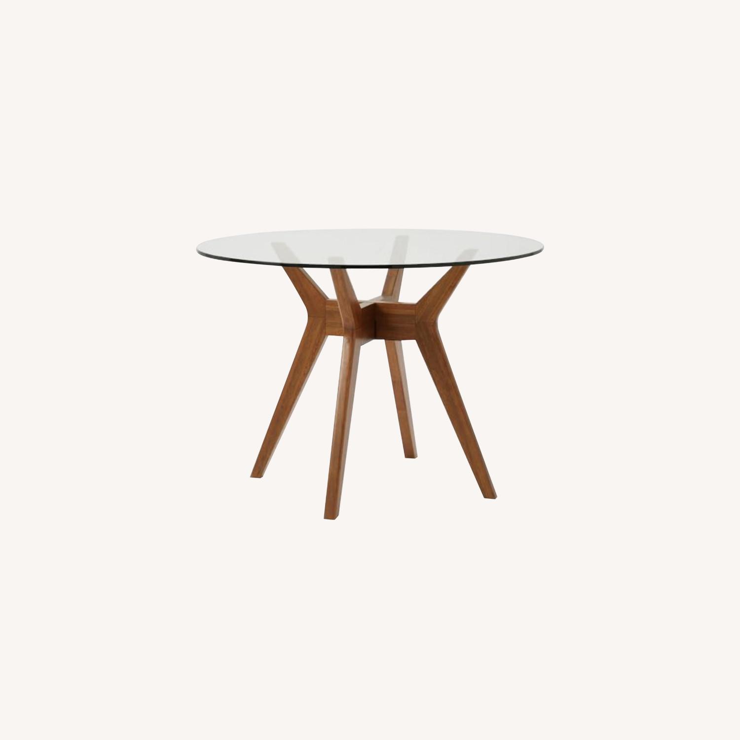 Seller's Notes:Our retro-inspired Jensen Dining Table was such a clear winner that we decided to make a round glass one with the same angular solid wood base and glass top. • 42"diam. x 30"h. • Walnut-stained solid wood frame. • Clear tempered glass top. • Seats up to 4. • Imported DETAILED SPECIFICATIONS • Overall product dimensions: 42"diam. x 30"h. • Thickness of tabletop: 0.5". • Overhang of tabletop: 7.5". • Comfortably seats up to: 4. • Clearance under table: 29.5". WE entertain often and the table is too small for our needs - thus it must go Photos are from the West Elm website - we are selling just the table