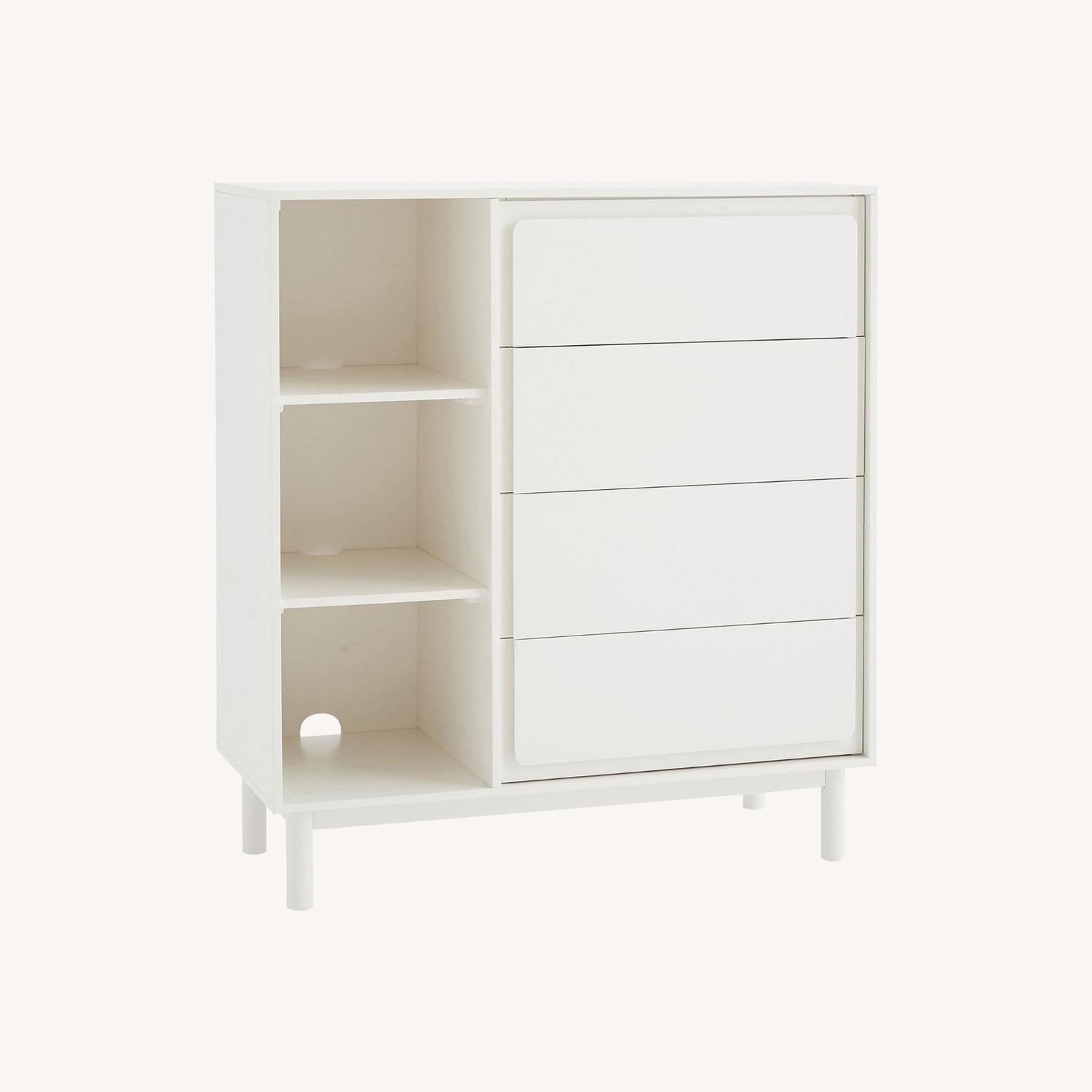 Seller's Notes:West Elm Kids Tilden 4-Drawer Dresser, bought in October 2022. It originally did not include baskets, but I purchased three baskets from IKEA that fit perfectly into the side shelf (happy to include them). Drawers are very clean inside with no stains or odors, and they slide smoothly with no issues at all.