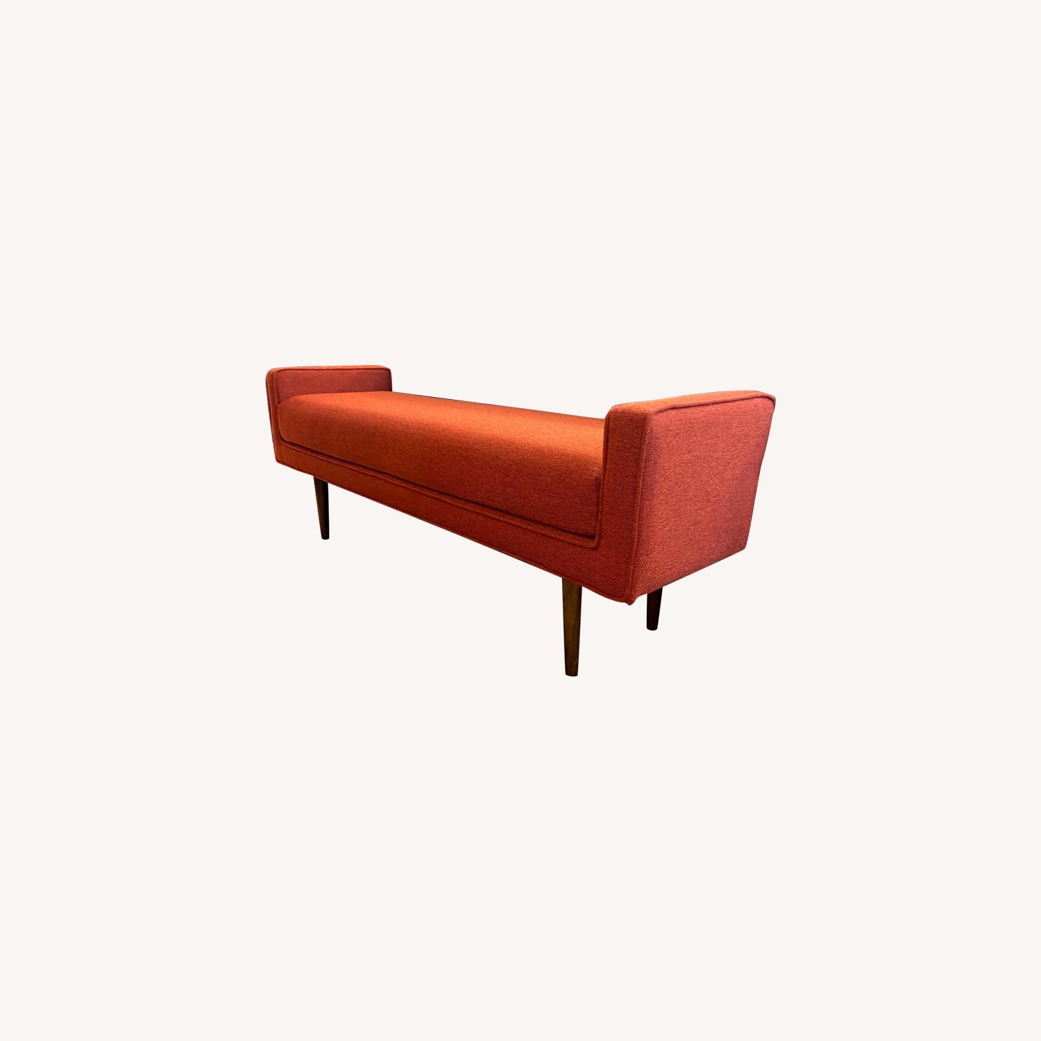 Seller's Notes:With its angled wood legs, tight frame and piped seams, the Landry Bench takes its cues from classic American mid-century designs. Its streamlined silhouette makes it ideal at the foot of a bed or in an entryway. 58.4"w x 16.3"d x 22.1"h | Color: Chili (orange-red) Twill | Solid wood legs in a Pecan finish. Upholstered cushion. Made in Vietnam.