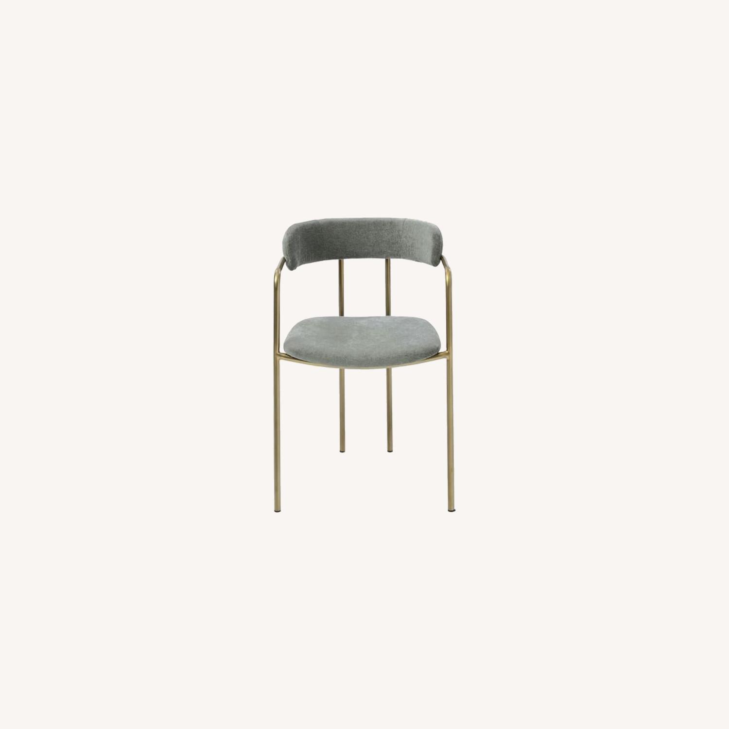 Seller's Notes:Beautiful Art Deco dining chairs! The seating is a stain-repellent upholstered material (perfect for dining), the color is a grey-silver and the legs are thing metal/brass. The chairs are in amazing condition, the design with the rounded back is modern but the materials make it warm. We've had them for about a year and we are leaving the city, the only reason for selling. They are a set of 6 !