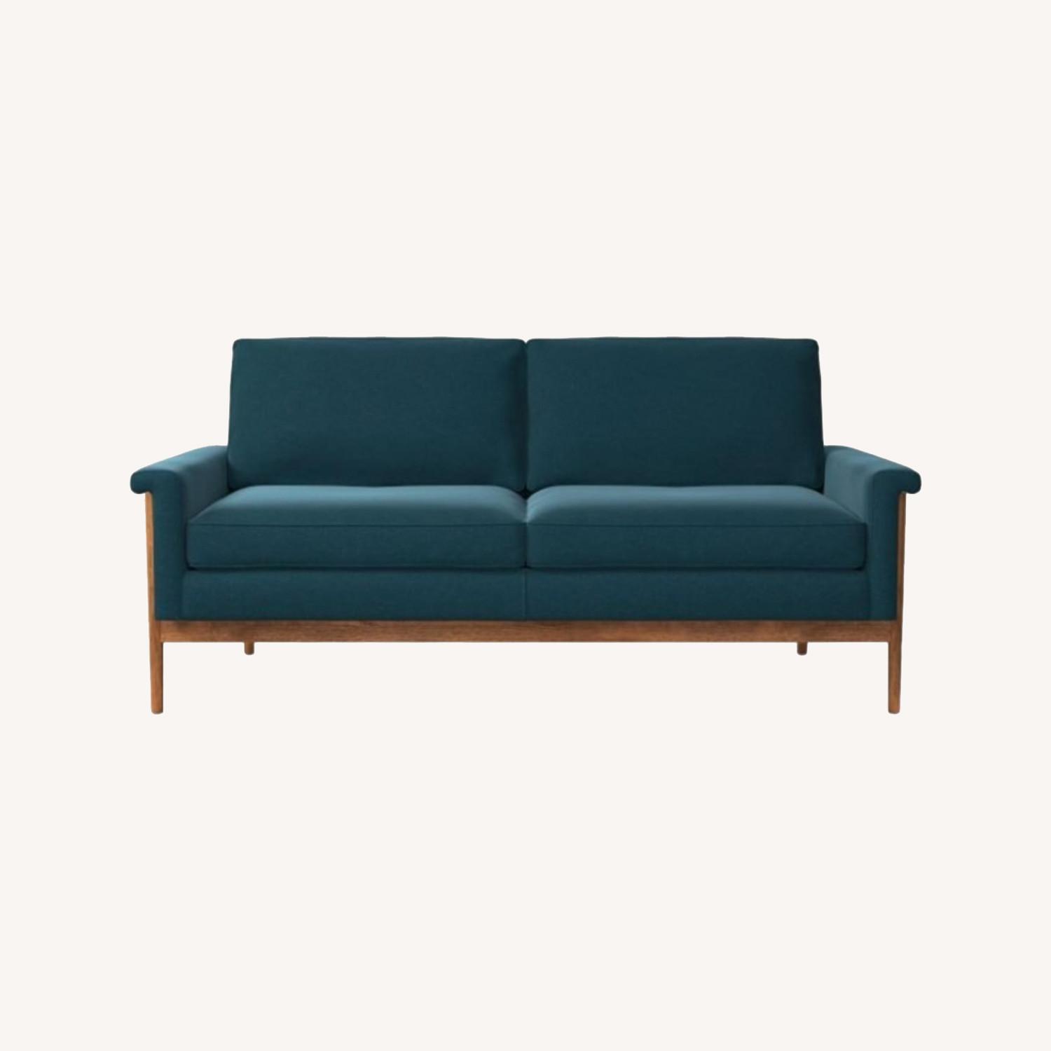 Seller's Notes:This beautiful sofa was made-to-order directly from West Elm. I loved to a bigger place and I need a bigger couch. Otherwise, I would 100% keep this piece. The fabric is West Elm's "Performance Velvet" in the color "Lagoon" [West Elm's description: a soft, short-pile fabric with a matte finish that's suitable for high-traffic use (tested up to 40,000 rubs). 100% polyester.] Wood is Pecan. Has minor blemishes but it is still in good condition! After a clean, it'll be good as new. :)