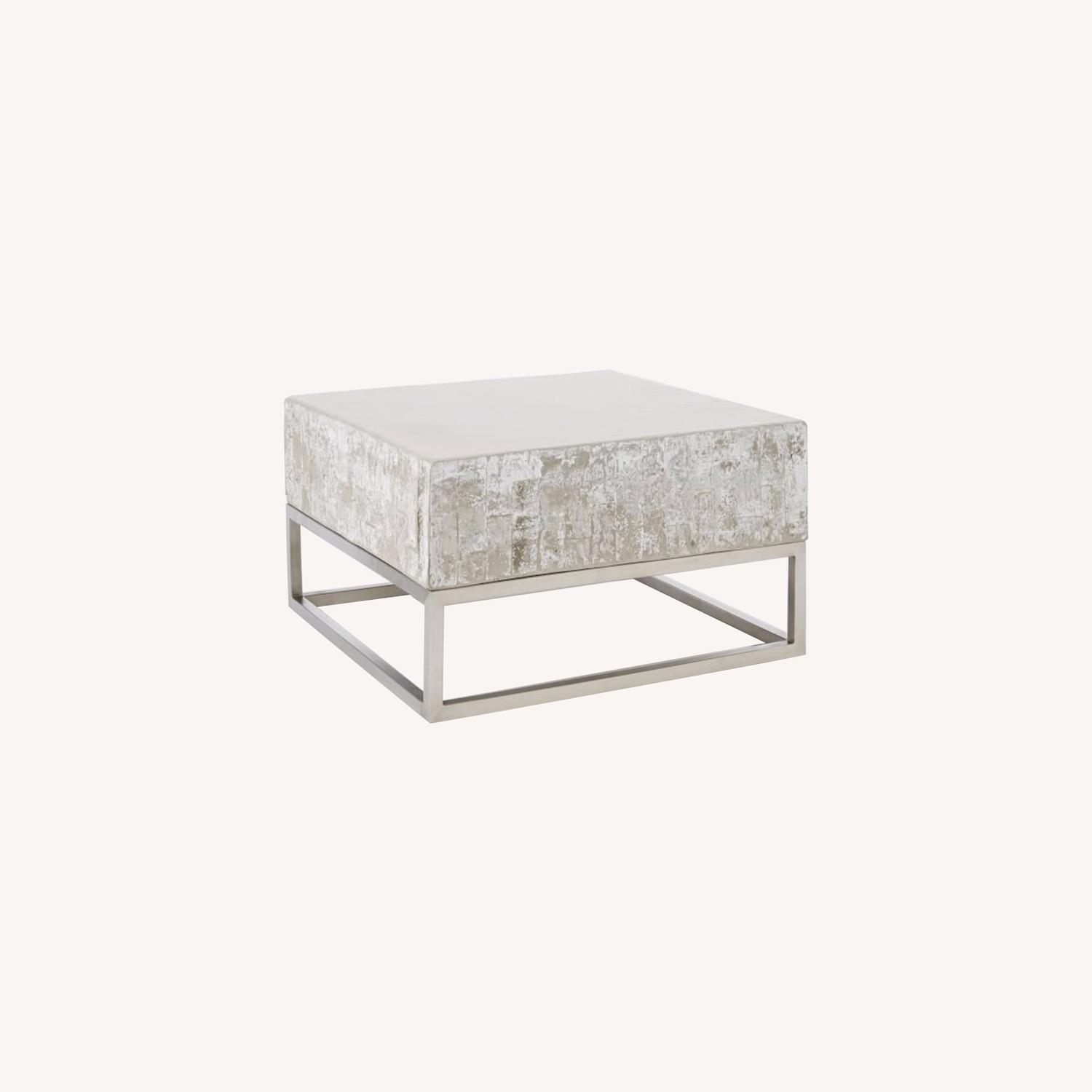 Seller's Notes:From West Elm's current collection (retails for $799 on their website today), this square coffee table has a Brutalist-inspired shape and materials. Its handmade top makes each one subtly unique. Great for indoor or outdoor use. Cast concrete top with a chore metal frame, it measures 30" square and 16" high. Very heavy (approx 190 pounds) and sturdy. Does have some hairline cracks on the top (see photos), but they do not affect the structural soundness of the item, it's still quite solid.
