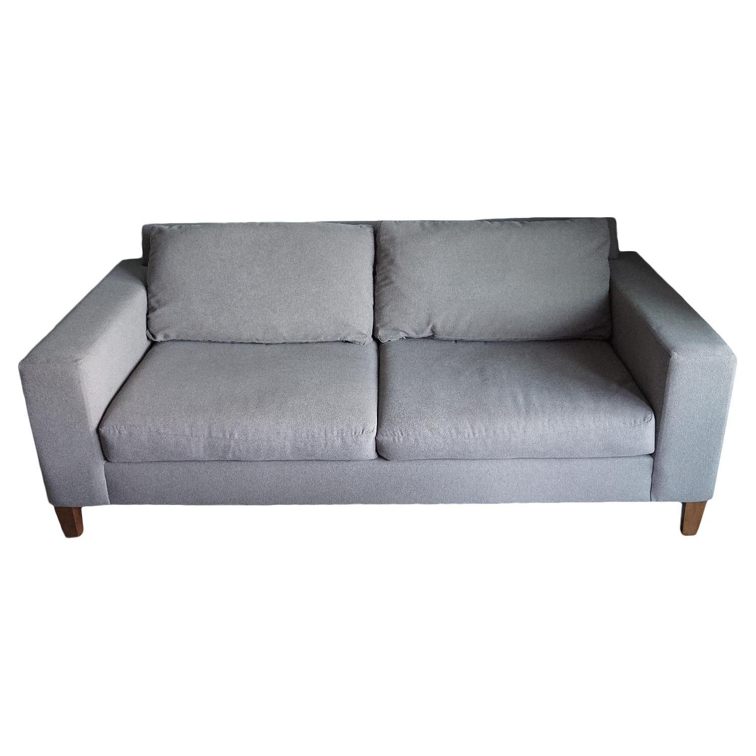 Seller's Notes:We purchased this couch about a year ago as our first 'real' couch when my fiancee and I got engaged. It's been really great as one of our first major pieces of furniture together. Super comfortable, durable, and a wonderful middle piece to our living room. Now, we are about to buy our first apt. Due to space constrictions, this couch is unfortunately too large, and we're going to have to downgrade to something else. Couch is in excellent condition. No stains of any kind (I never allowed people to eat on it), no tears, and no damage to the fabric or legs. As for materials, this couch is the Marled Microfiber in Mink. Down blend fill. Tapered pecan legs. Easy on the eyes, goes with everything.