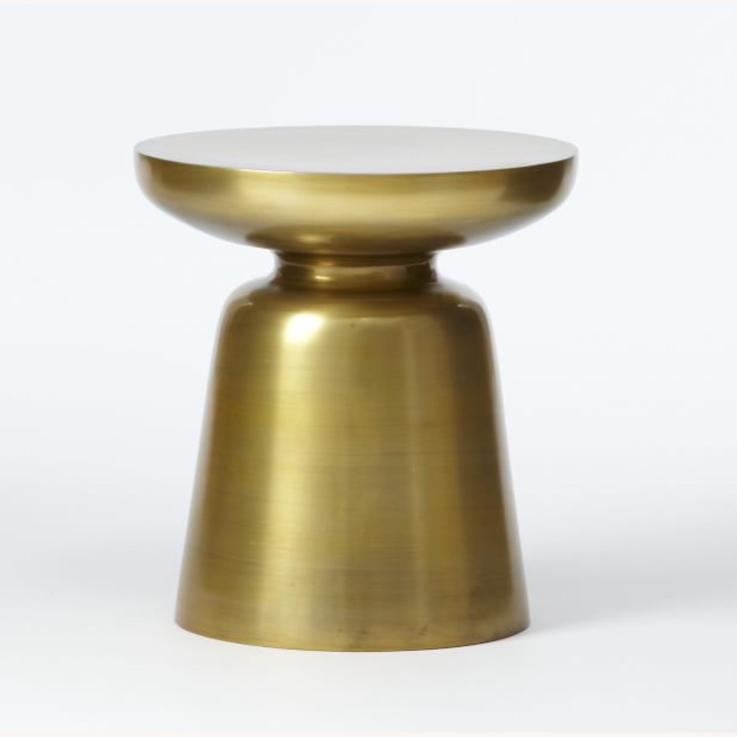 Seller's Notes:Throwback West Elm martini-style side table with a brassy finish. Perfect as a living room end table, trendy bedside table or decorative piece (throw some flowers, candles on top!) that's suitable for both indoor and outdoor use.