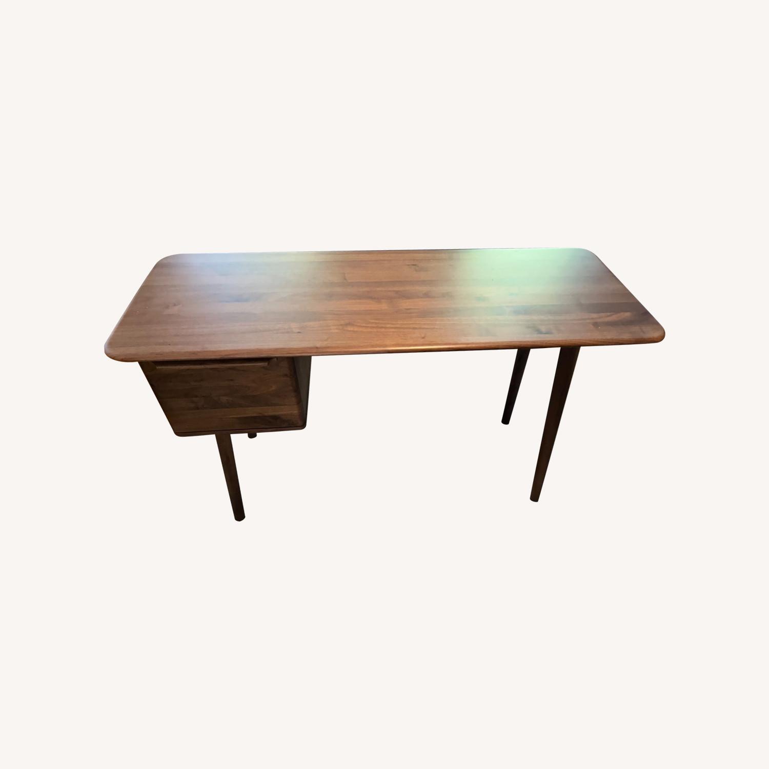 Seller's Notes:We love this desk! We are only selling it because our new space isn’t the right size for it. It is in excellent shape (just has the one very small scratch, as shown in the photo). Here’s the information about it from West Elm: Solid and engineered wood. Covered in a lacquered Walnut finish. All wood is kiln-dried for added durability. 1 cabinet with 1 adjustable shelf.