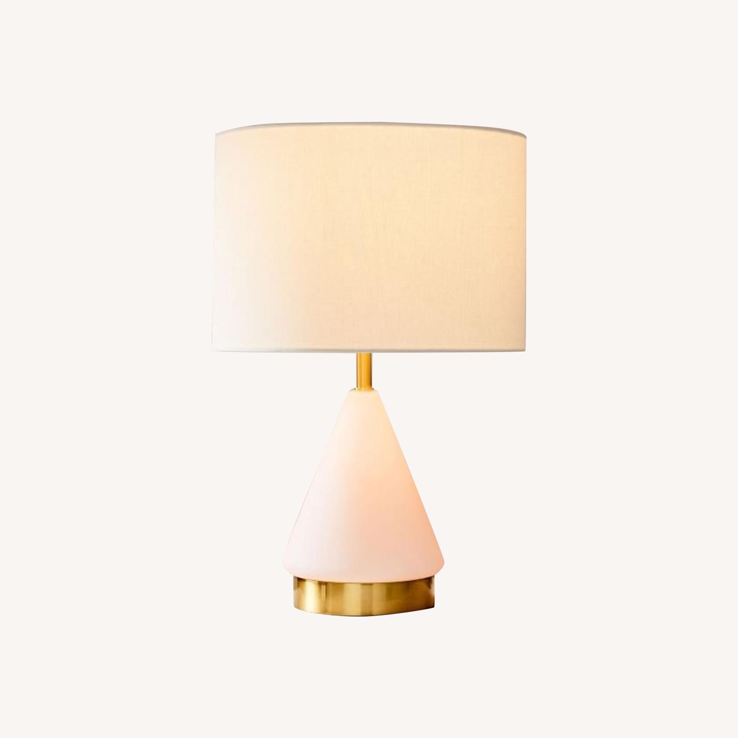 Seller's Notes:Gorgeous table lamps! They were our bedside lamps for two years, now we’ve moved and no longer need them. No blemishes or noticeable wear. Bulbs included. KEY DETAILS 13"diam. x 19.75"h. Mouth-blown glass body. Metal base in an Antique Brass finish. Linen shade in White. Cloth-wrapped cord. Built-in USB port at base. Plug-in. Imported.