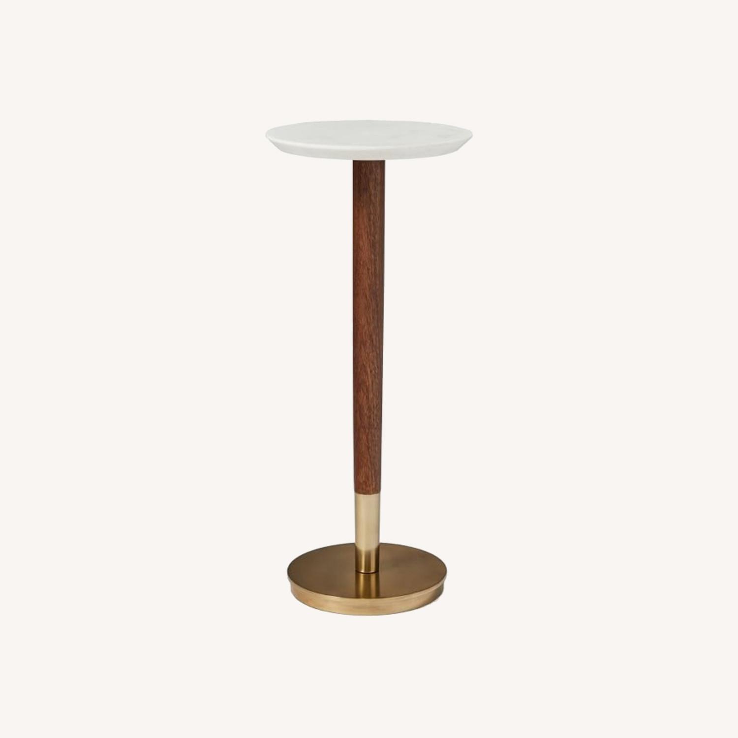 Seller's Notes:Marble top. Kiln-dried mango wood stem. The mango wood used on this product is sustainably sourced from trees that no longer produce fruit. Metal base. Due to the natural material, variations in marble veining and color are to be expected. Made in a Fair Trade Certified™ facility, directly benefiting the workers who make it. Made in India.