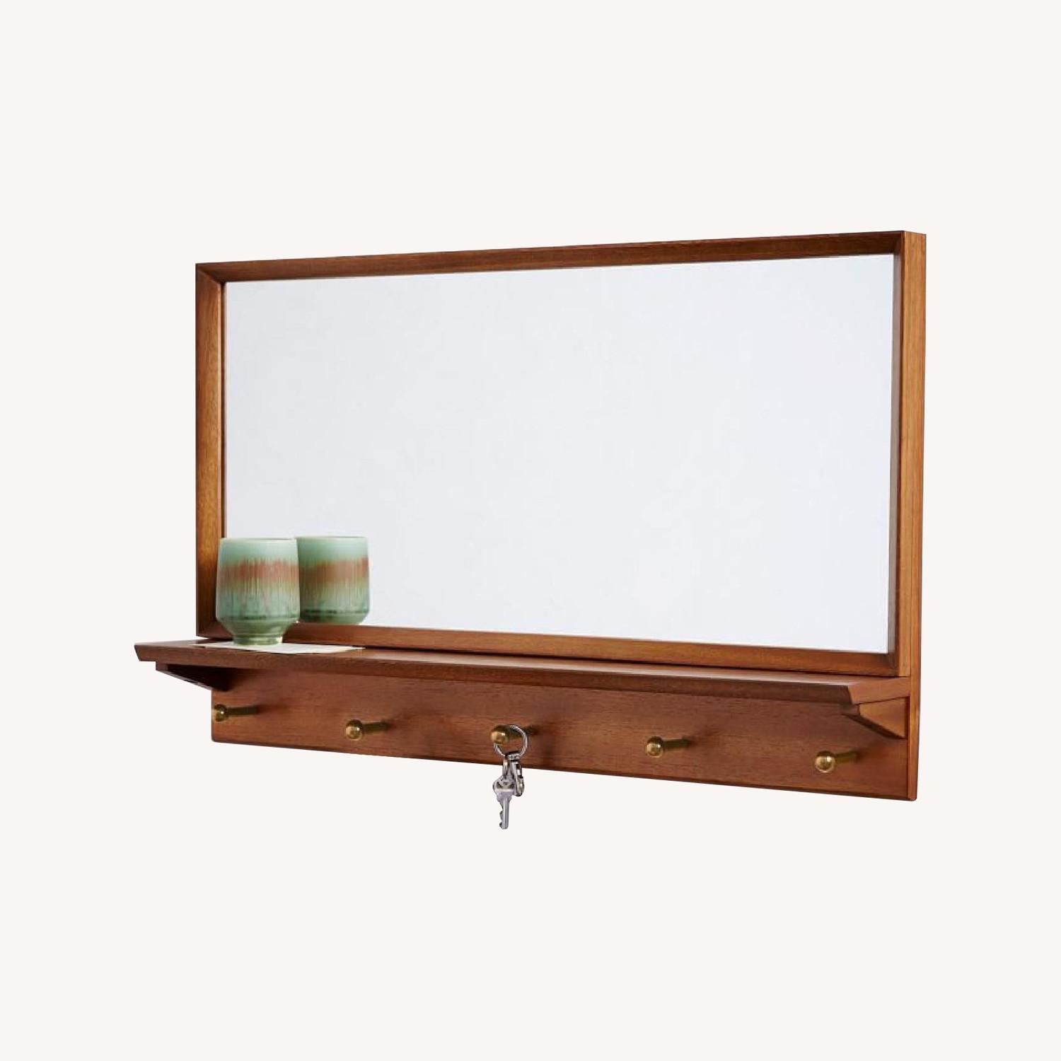 Seller's Notes:Final Price Markdown! Beautiful solid wood mirror with shelf and 5 pegs. Perfect for entryway organization - hang everything from hats, outerwear, keys, backpacks, bags and purses - works wonderfully for dog leashes as well! The shelf is the perfect place to set down your phone or sunglasses. Solid wood in a Pecan finish. Antique Bronze hardware. Hanging hardware included. Each of the 5 hanging pegs can hold a maximum of 5 lbs. Part of the West Elm Mod-Century Modern entryway collection. Coordinates with both the acorn and pecan wood finishes in this collection. Made in a Fair Trade Certified™ facility. Only 6 months old - no visible scratches or defects!