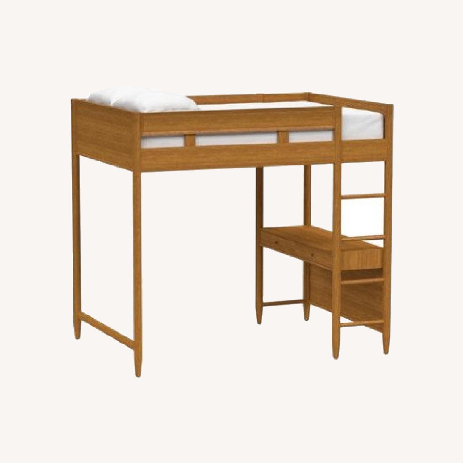 Seller's Notes:This beautiful west elm + pbt Mid Century loft bed fits a full size mattress and has a beautiful desk built in underneath. This piece has both style and substance and immediately upgrades any room it's in. It's been used for less than a year, and therefore is in like-new condition with only a few light scratches on the desk portion. The pictures are of it in a very small NYC apt room, but you can see how much floor space it adds to even a small room!