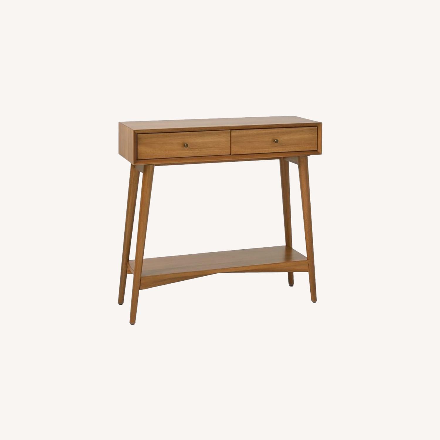 Seller's Notes:Scaled for smaller spaces, our Mid-Century Mini Console borrows its tapered legs, angled face and understated details from iconic '50s and '60s furniture design. It's fitted with drawers and an open shelf, for a handsome storage solution in the entryway or living room. 34”w x 12”d x 32”h. Solid eucalyptus wood legs. Kiln-dried solid eucalyptus wood and engineered wood with an Acacia wood veneer.