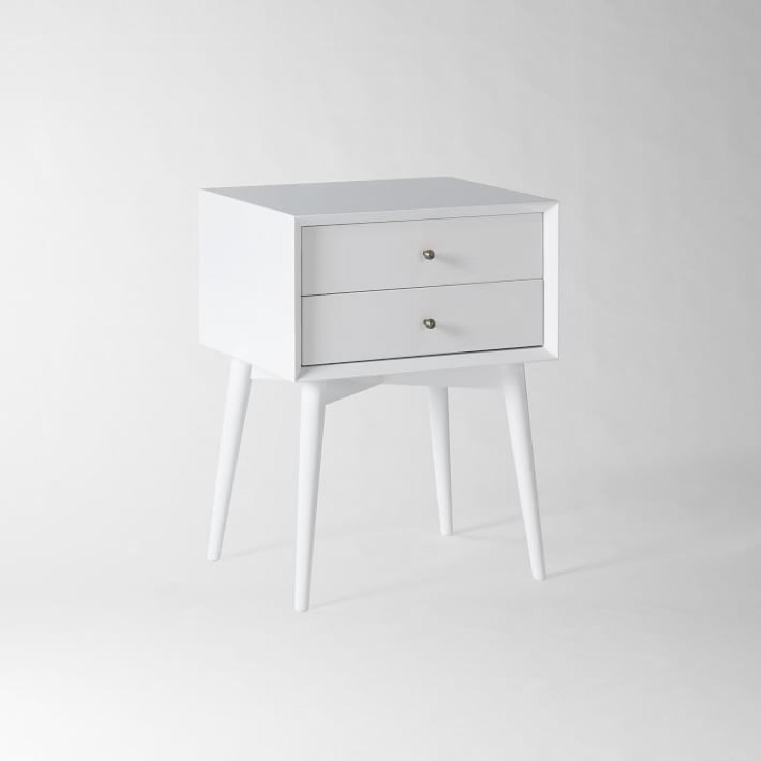 Seller's Notes:Simple, sophisticated storage. Inspired by mid-century design, the Mid-Century Nightstand borrows its slim legs, angled face and understated retro details from iconic '50s and '60s furniture silhouettes. Acacia veneer over solid wood base and frame in a White lacquer finish. Beveled front edges. Drawers open on solid wood glides. Antiqued bronze hardware. These nightstands are in perfect shape. Hardly used. They were in our spare room.