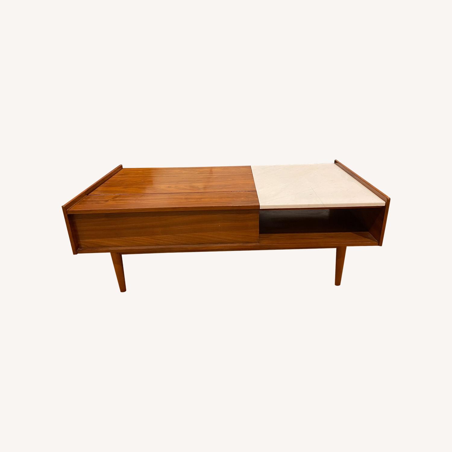 Seller's Notes:Great mid-century modern coffee table with pop-up feature. Some light wear and tear.